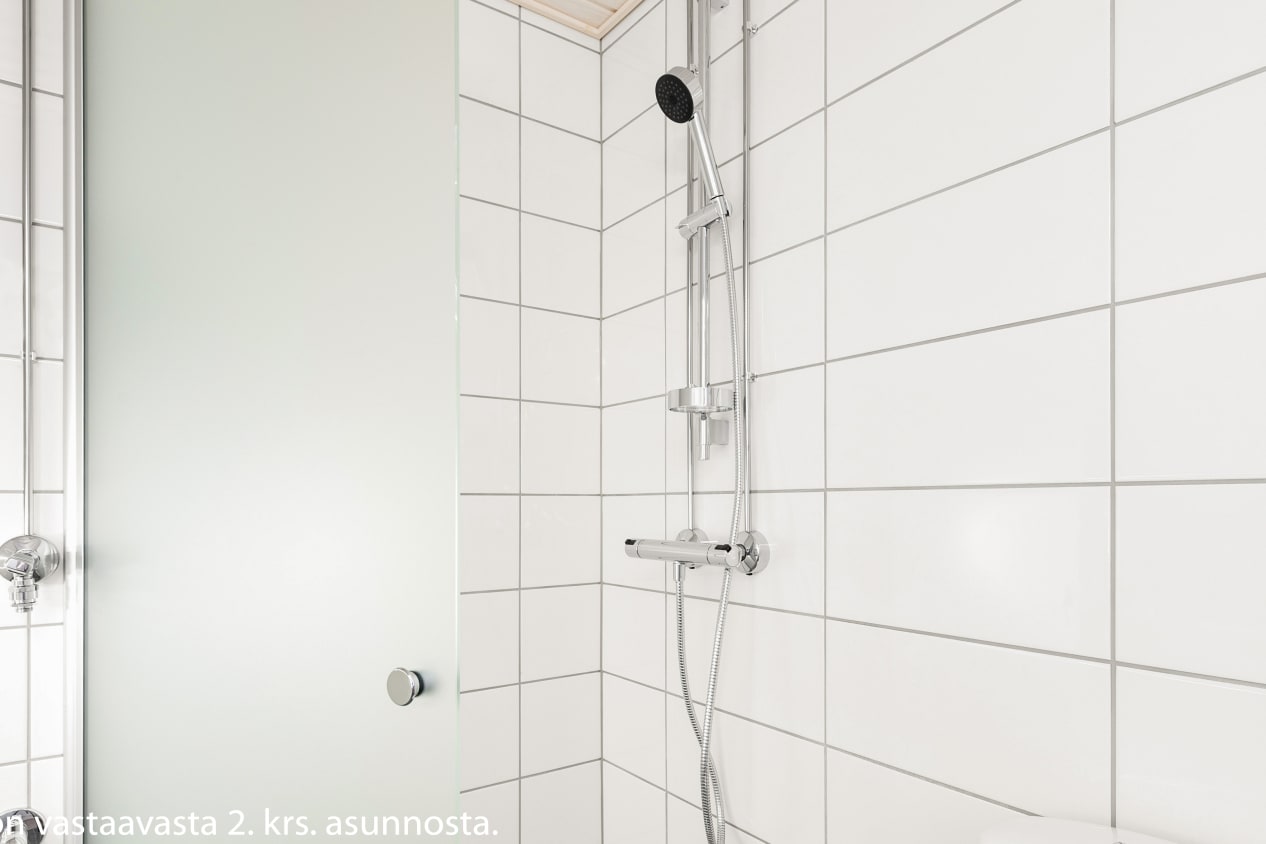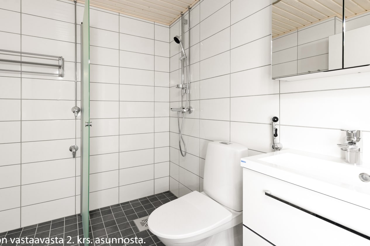 Kylpyhuoneessa on valkoiset Kide-malliston kotimaiset kalusteet. Seinät ovat valkoista laattaa ja lattia on harmaa. Pesukoneelle on paikka.