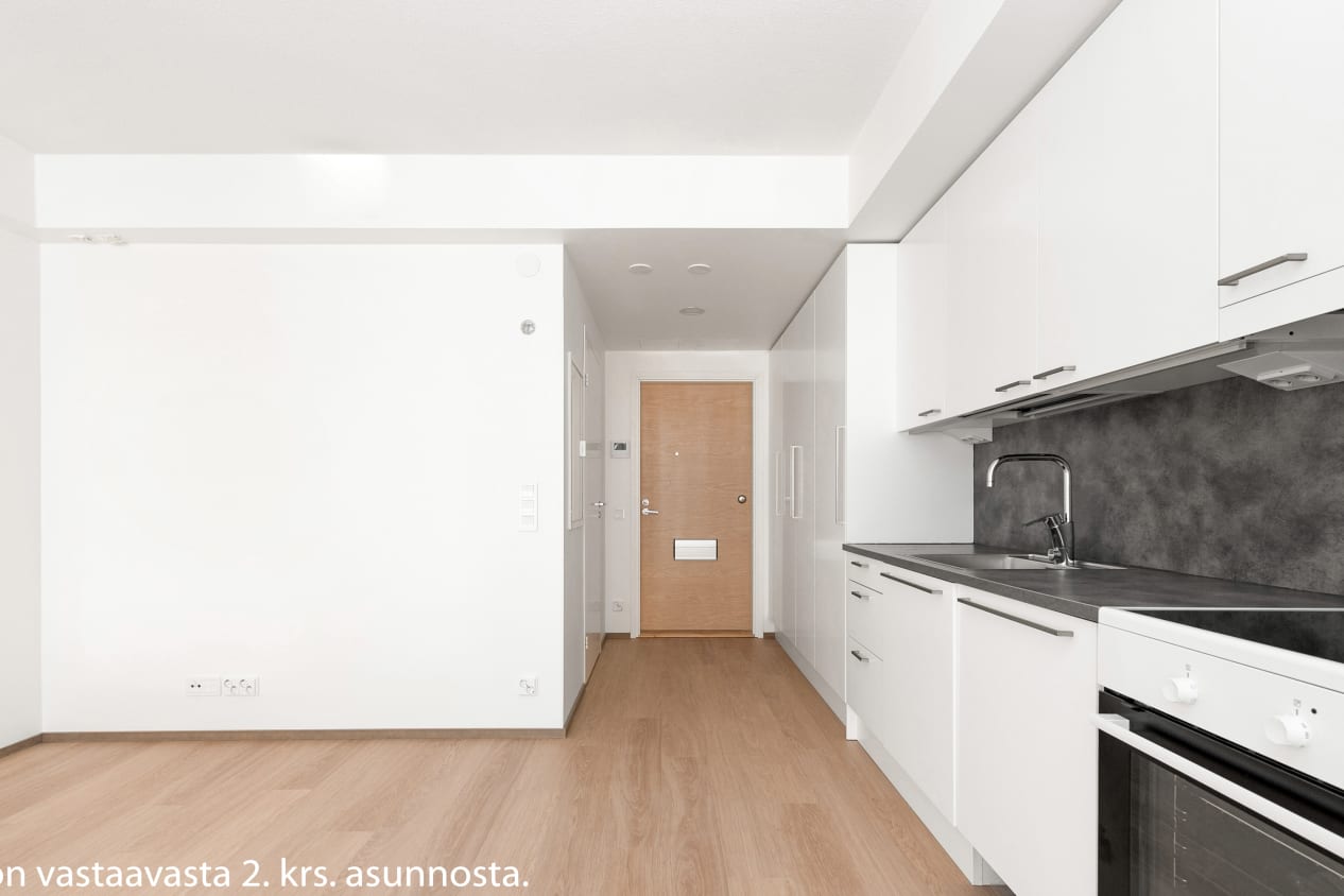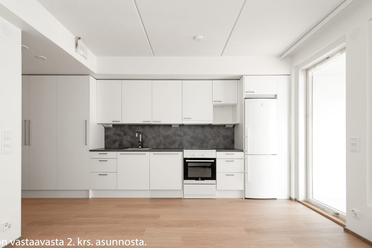 Nykyaikainen pikkukoti on avoin ja selkeä. Keittiötilan ja olohuoneen muodostaman yhtenäisen tilan kalustat helposti omaan tyyliisi sopivaksi. Reilun kokoinen parveke on lasitettu. Eteisen komerot ovat valkoisia ja ikkunoissa on valmiina sälekaihtimet. Lattia on vaaleaa tammilaminaattia ja seinät on maalattu valkoisiksi.