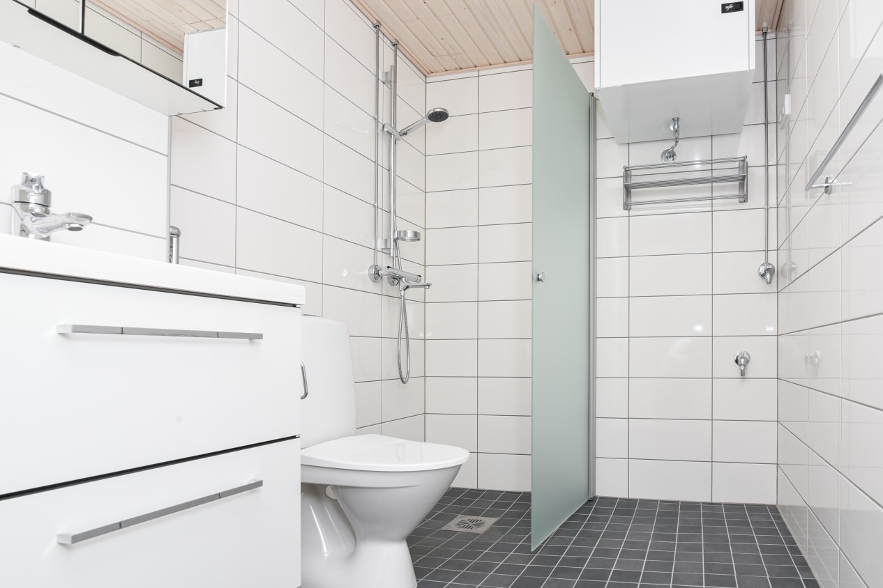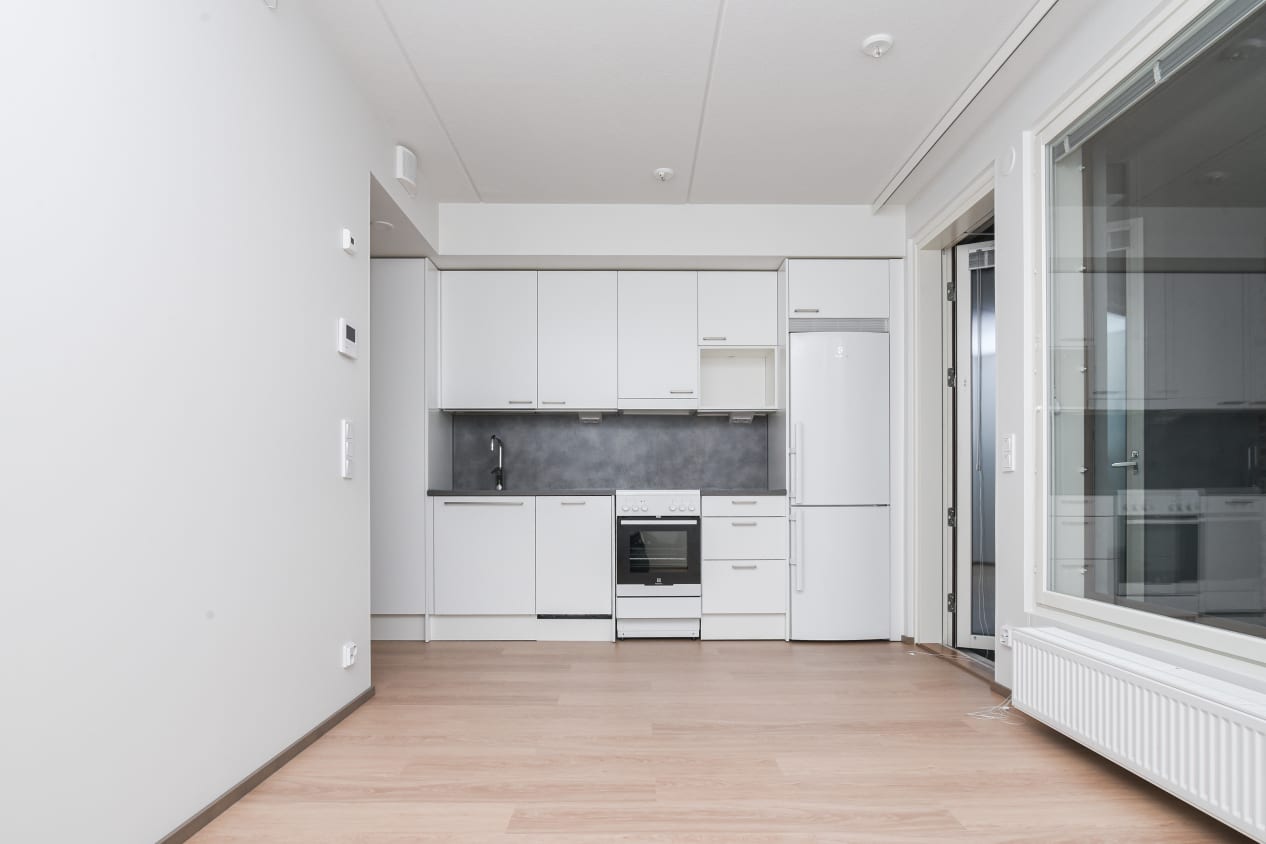 Uuden uutukainen pikkukoti on ihanan valoisa. Keittiö ja olohuone yhdistyvät avoimeksi oleskelutilaksi, jossa tilantuntua lisää melkein koko seinän kokoinen ikkuna. Hulppea, koko asunnon levyinen lasitettu parveke on kuin lisähuone, josta on näkymä asukaspuiston puolelle. Eteisen komerot ovat valkoisia ja ikkunoissa on valmiina sälekaihtimet. Lattia on vaaleaa tammilaminaattia ja seinät on maalattu valkoisiksi. Keittiökaapistot ovat raikkaan valkoiset ja ylä- ja alakaappien välinen tila sekä työtaso ovat harmaata laminaattia. Varustukseen kuuluu astianpesukone, induktioliesi ja jääkaappipakastin. Kodinkoneet ovat kalusteisiin integroituja. Kylpyhuoneessa on valkoiset SATOn Kide-malliston kalusteet. Seinät ovat valkoista laattaa ja lattia on harmaa. Pesukoneelle on paikka.