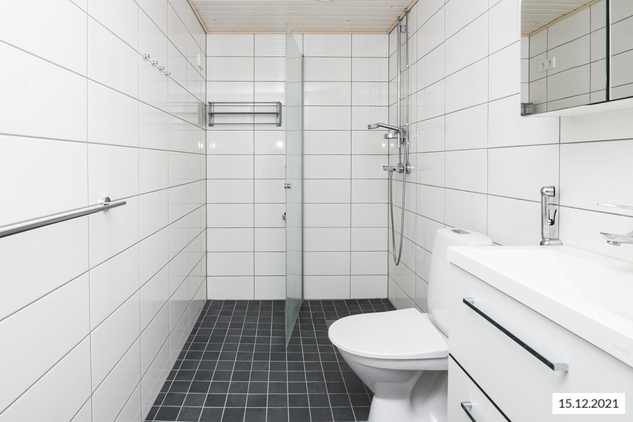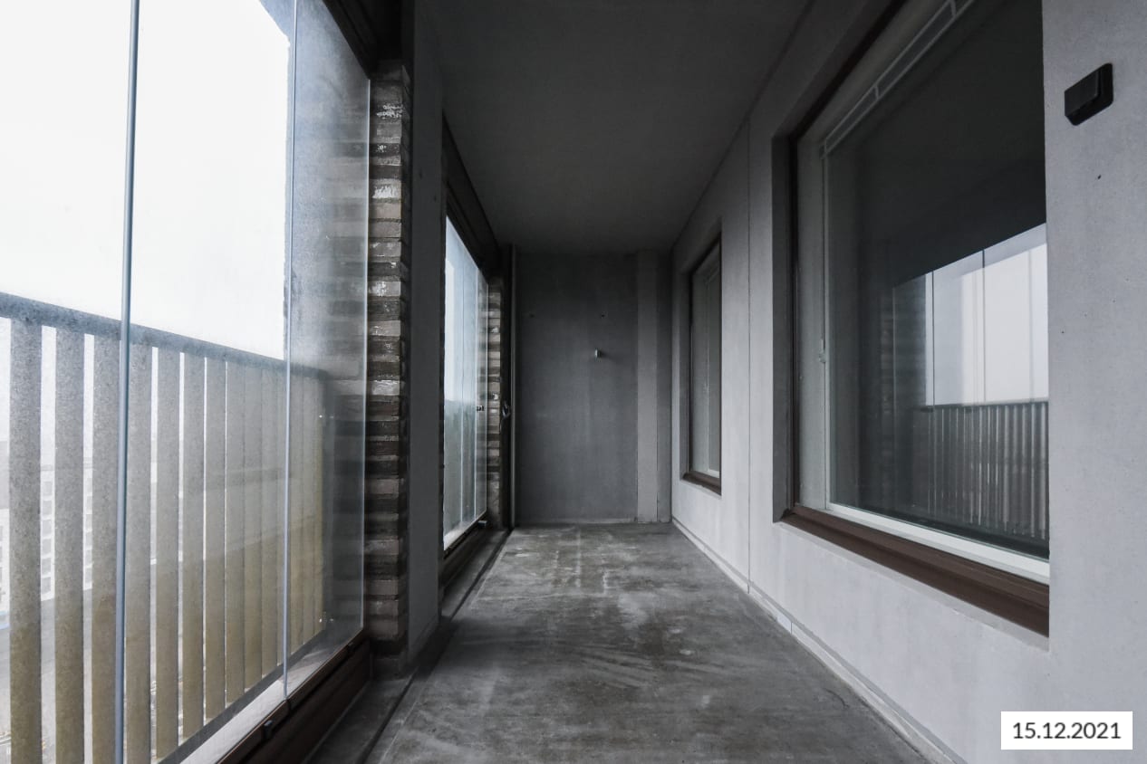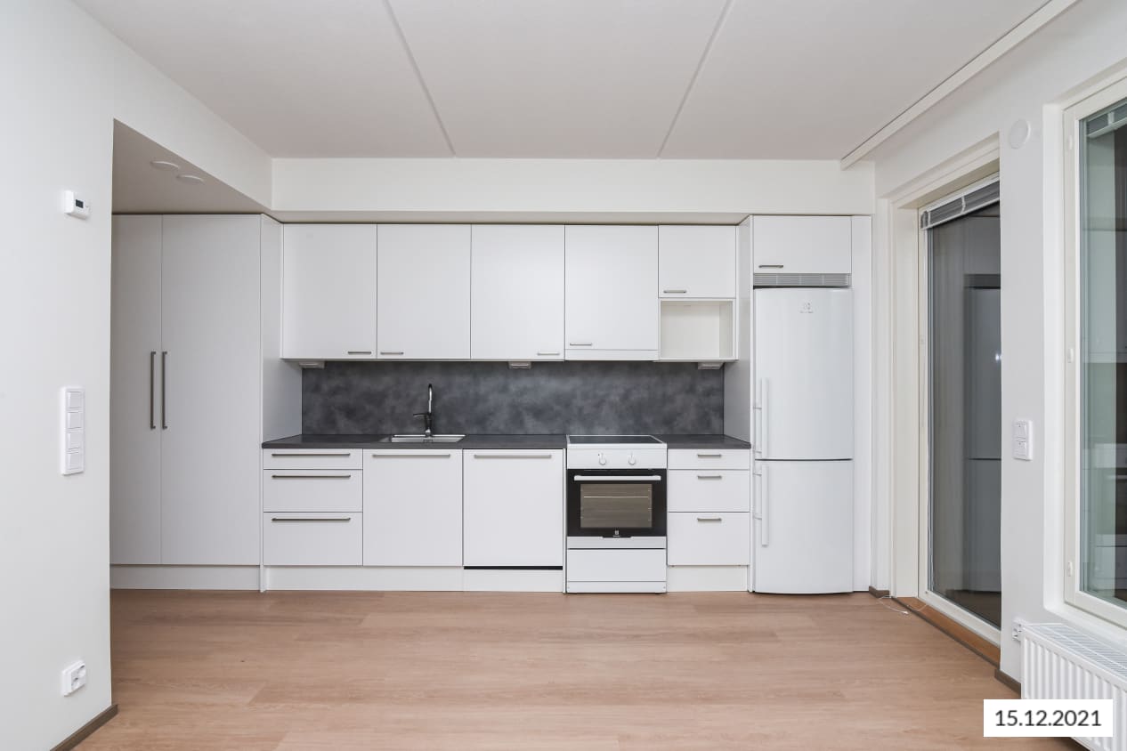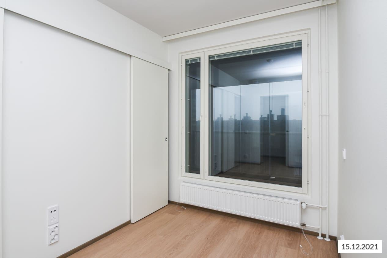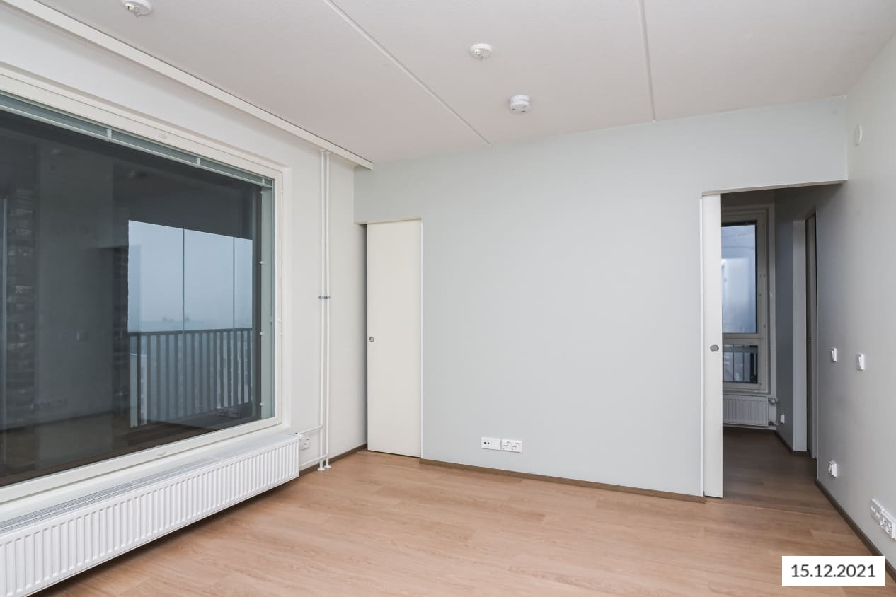 Nykyaikainen kulmahuoneisto korkealla on selkeä ja ilmava. Kodin sydän on avoimen keittiötilan ja olohuoneen muodostama avara oleskelutila. Valoa ja tilantuntua lisäävät korkeat ikkunat ja koko asunnon levyinen lasitettu parveke. Makuuhuoneessa on ikkuna kahteen suuntaan ja ylellisen paljon tilaa vaatesäilytykselle erillisessä vaatehuoneessa. sälekaihtimet. Lattia on vaaleaa tammilaminaattia ja seinät on maalattu valkoisiksi. Keittiökaapistot ovat raikkaan valkoiset ja ylä- ja alakaappien välinen tila sekä työtaso ovat harmaata laminaattia. Varustukseen kuuluu astianpesukone, induktioliesi ja jääkaappipakastin. Kodinkoneet ovat kalusteisiin integroituja.