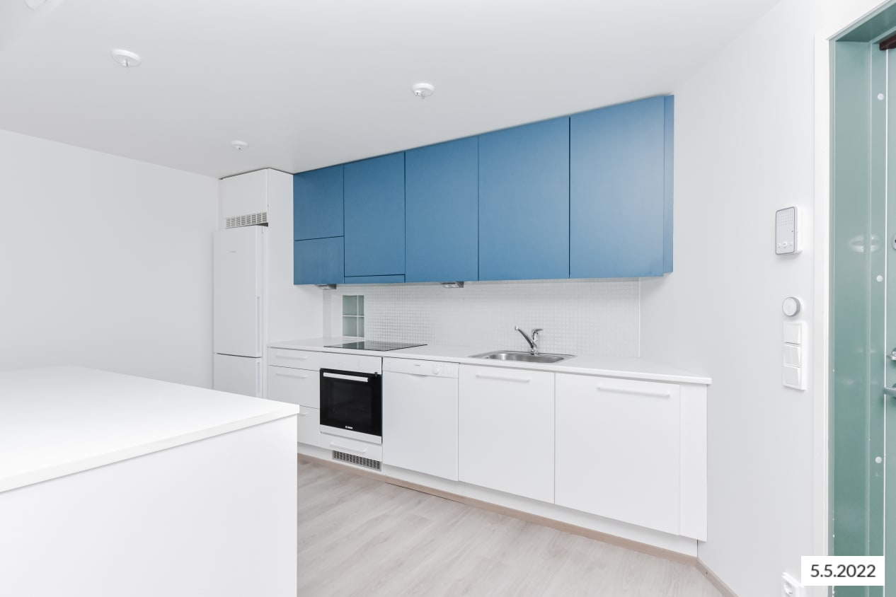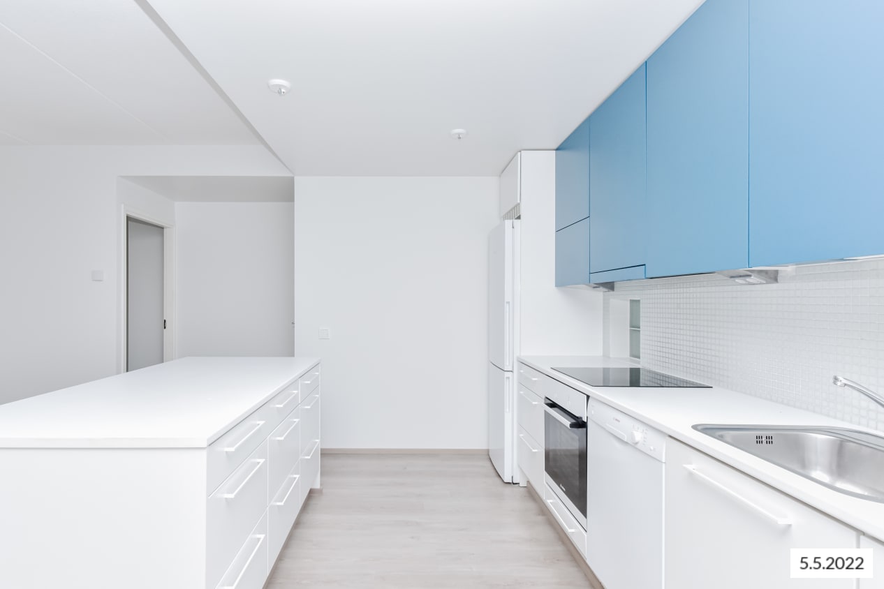 Modernin kodin lattiat ovat laminaattia. Keittiön alakaappien ja korkeiden kaappien ovet ovat valkoiset ja yläkaappien ovet ja avohyllyköt ovat petroolin siniset. Työtasot ovat valkoista laminaattia ja ylä- ja alakaappien välinen tila on laatoitettu lasimosaiikkilaatoilla. Keittiön varusteena on keraaminen liesitaso ja kalusteuuni, liesikupu, jää-pakastinkaappi, astianpesukone ja tilavaraus mikroaaltouunille. Kodinkoneet ovat valkoisia.