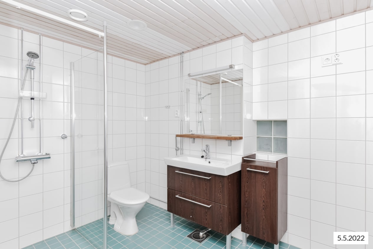 Laatoitetun kylpyhuoneen seinät ovat kiiltävän valkoiset ja lattiat petroolin siniset. Kalusteet ovat tummanruskeaa puukuviota. Pesukoneelle ja kuivausrummulle on tilavaraus.