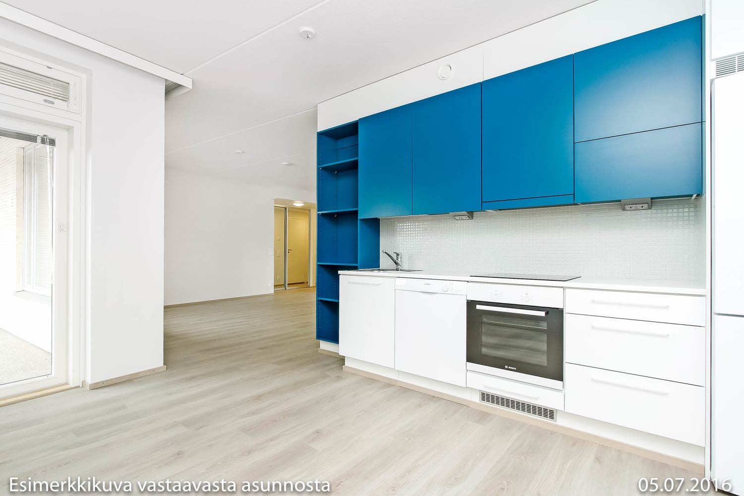 Modernin kodin lattiat ovat laminaattia. Keittiön alakaappien ja korkeiden kaappien ovet ovat valkoiset ja yläkaappien ovet ja avohyllyköt ovat petroolin siniset. Työtasot ovat valkoista laminaattia ja ylä- ja alakaappien välinen tila on laatoitettu lasimosaiikkilaatoilla. Keittiön varusteena on keraaminen liesitaso ja kalusteuuni, liesikupu, jää-pakastinkaappi, astianpesukone ja tilavaraus mikroaaltouunille. Kodinkoneet ovat valkoisia. Laatoitetun kylpyhuoneen seinät ovat kiiltävän valkoiset ja lattiat petroolin siniset. Kalusteet ovat tummanruskeaa puukuviota. Pesukoneelle ja kuivausrummulle on tilavaraus.