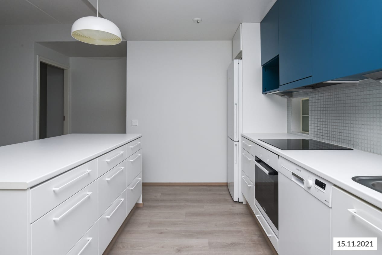 Modernin kodin lattiat ovat laminaattia. Keittiön alakaappien ja korkeiden kaappien ovet ovat valkoiset ja yläkaappien ovet ja avohyllyköt ovat petroolin siniset. Työtasot ovat valkoista laminaattia ja ylä- ja alakaappien välinen tila on laatoitettu lasimosaiikkilaatoilla. Keittiön varusteena on keraaminen liesitaso ja kalusteuuni, liesikupu, jää-pakastinkaappi, astianpesukone ja tilavaraus mikroaaltouunille. Kodinkoneet ovat valkoisia.