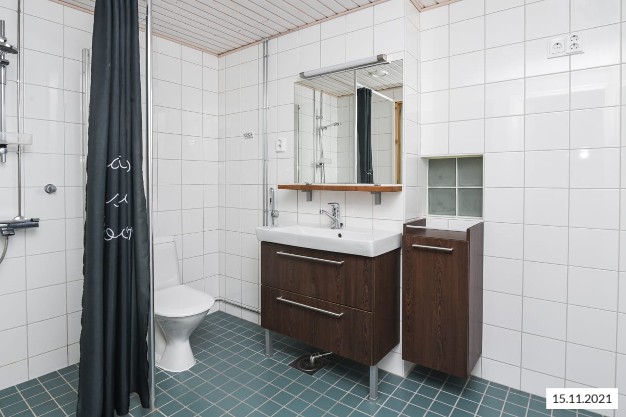 Laatoitetun kylpyhuoneen seinät ovat kiiltävän valkoiset ja lattiat petroolin siniset. Kalusteet ovat tummanruskeaa puukuviota. Pesukoneelle ja kuivausrummulle on tilavaraus.