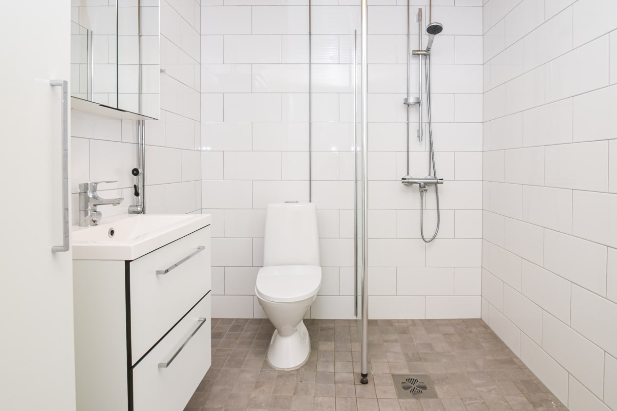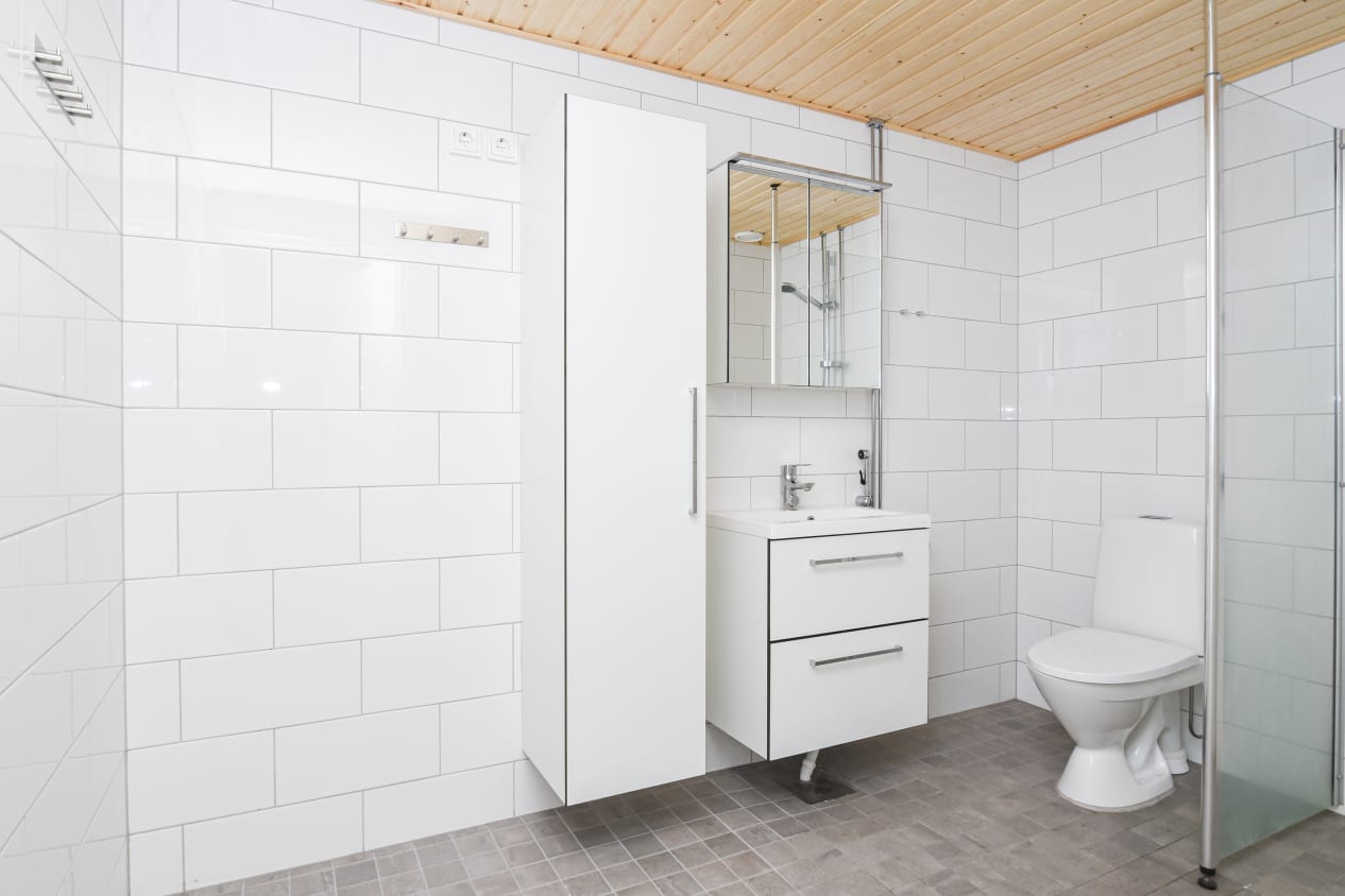Kylpyhuoneessa on valkoiset SATOn Kide-malliston kalusteet. Seinät ovat valkoista laattaa ja lattia on harmaa. Pesukoneelle ja kuivausrummulle on paikka.
