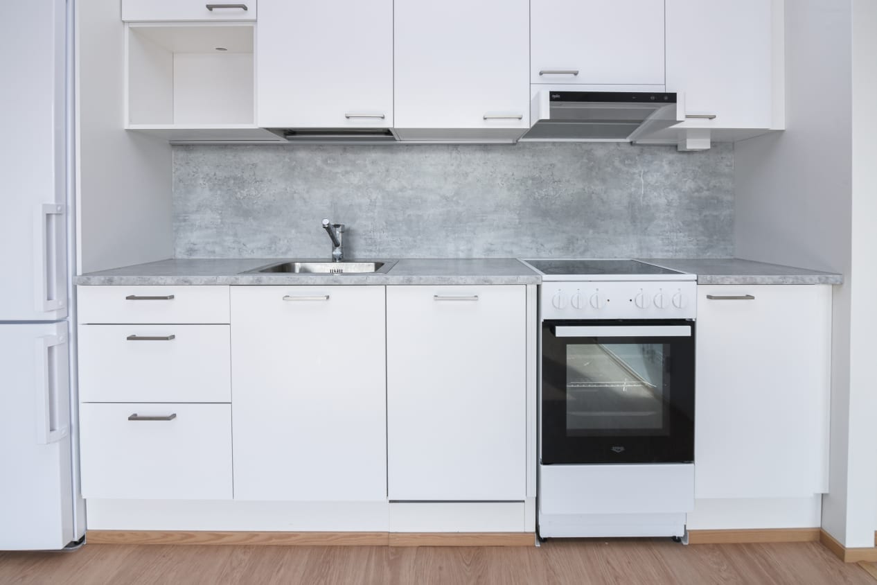 Keittiökaapistot ovat raikkaan valkoiset ja ylä- ja alakaappien välinen tila sekä työtaso ovat harmaata laminaattia. Varustukseen kuuluu astianpesukone, keraaminen liesi ja jääkaappipakastin.