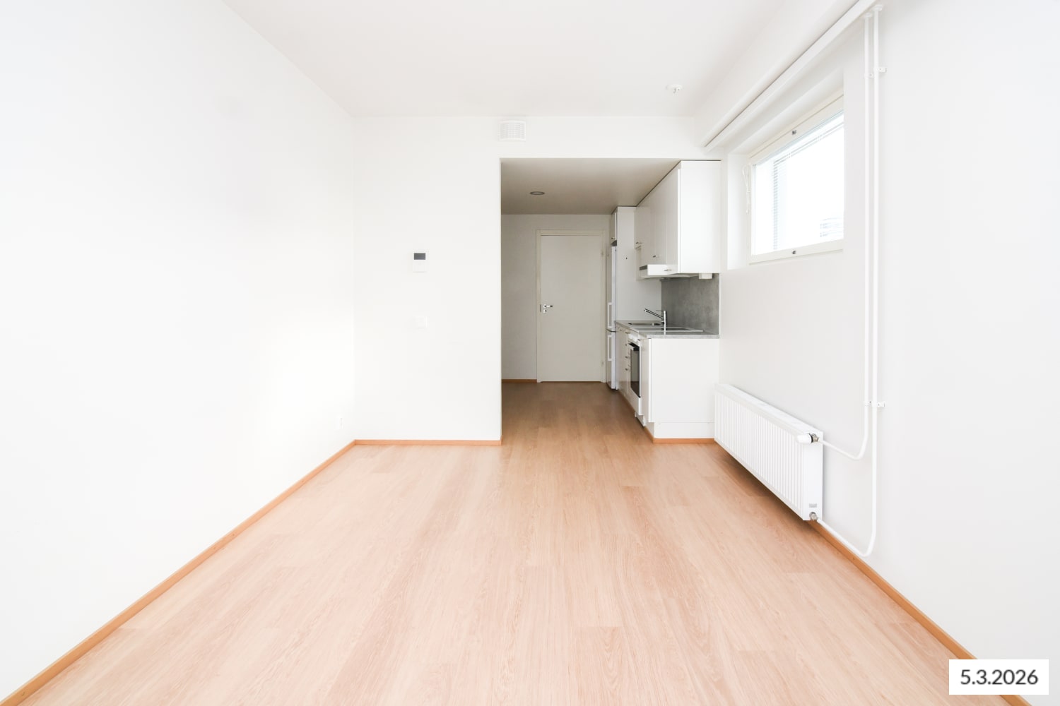 Neliöiltään tilavamman tuntuinen yksiö on kerroksen nurkassa ja kahteen suuntaan aukeavat ikkunat ja ranskalainen parveke tuovat kotiin ilmavuutta ja tilan tuntua. Eteisen komerot ovat valkoisia ja ikkunoissa on valmiina sälekaihtimet. Lattia on vaaleaa tammilaminaattia ja seinät on maalattu valkoisiksi. Keittiökaapistot ovat raikkaan valkoiset ja ylä- ja alakaappien välinen tila sekä työtaso ovat harmaata laminaattia. Varustukseen kuuluu astianpesukone, keraaminen liesi ja jääkaappipakastin. Kylpyhuoneessa on valkoiset SATOn Kide-malliston kalusteet. Seinät ovat valkoista laattaa ja lattia on harmaa. Pesukoneelle ja kuivausrummulle on paikka.