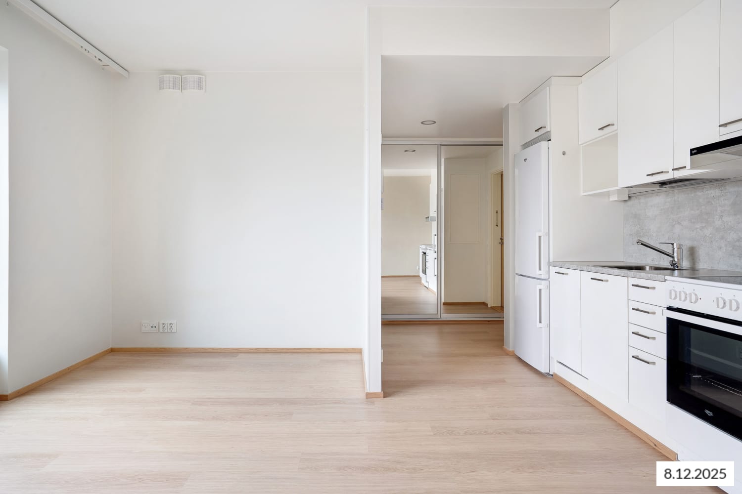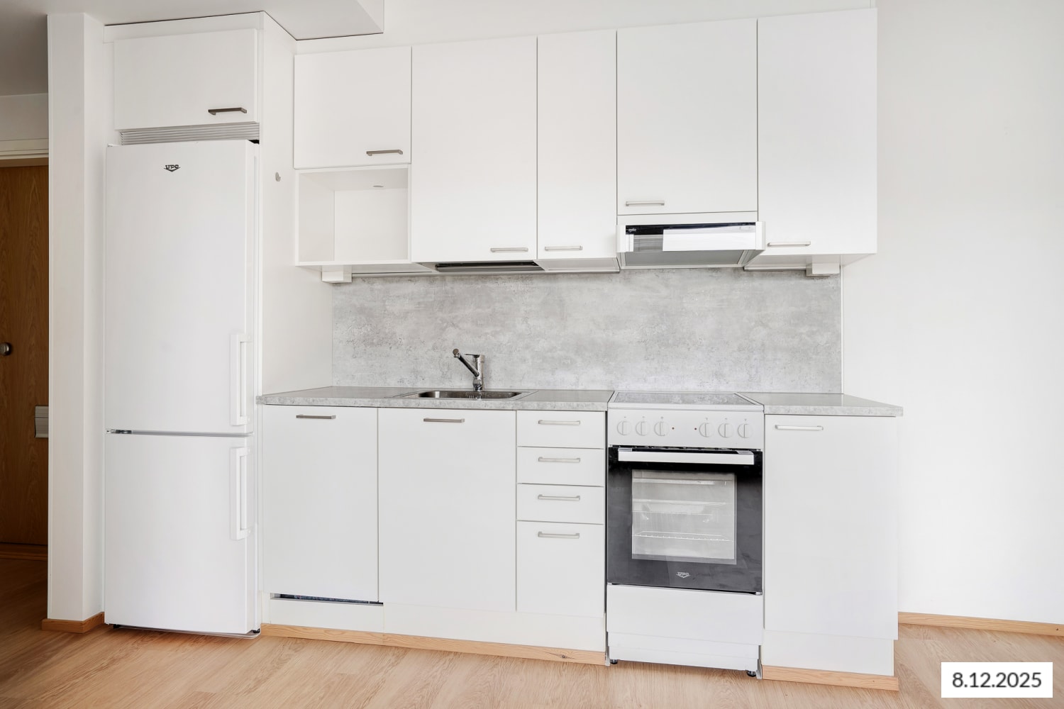 Kotoisa yksiö viehättää avoimella selkeydellään ja helpolla kalustettavuudella, johon ilmavuutta tuo ranskalainen parveke. Keittiötilan yhteyteen sijoitat viihtyisän ruokailutilan, johon sopii ruokapöytä. Eteisen komerot ovat valkoisia ja ikkunoissa on valmiina sälekaihtimet. Lattia on vaaleaa tammilaminaattia ja seinät on maalattu valkoisiksi. Keittiökaapistot ovat raikkaan valkoiset ja ylä- ja alakaappien välinen tila sekä työtaso ovat harmaata laminaattia. Varustukseen kuuluu astianpesukone, keraaminen liesi ja jääkaappipakastin. Kylpyhuoneessa on valkoiset SATOn Kide-malliston kalusteet. Seinät ovat valkoista laattaa ja lattia on harmaa. Pesukoneelle ja kuivausrummulle on paikka.