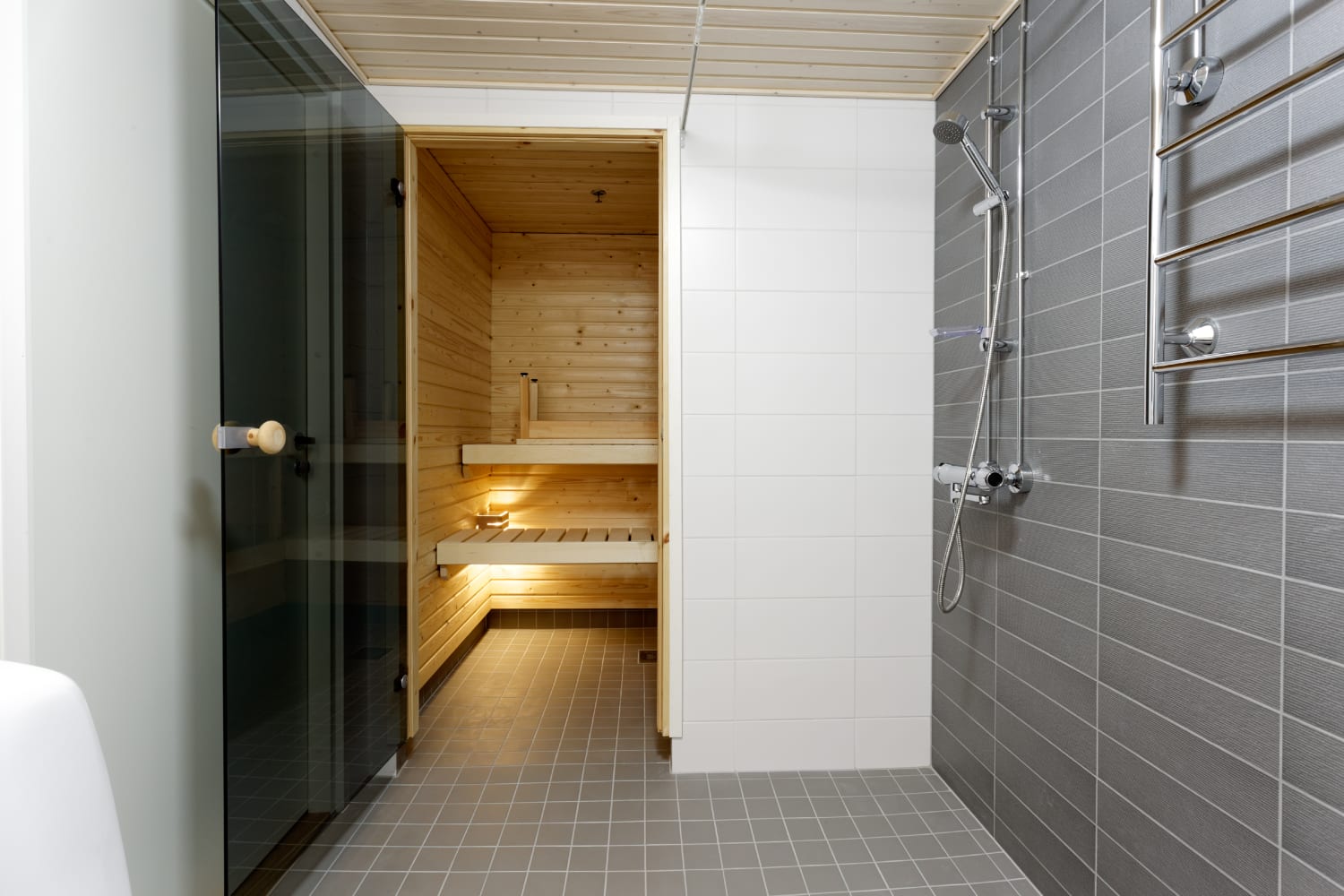 Kodin pehmeän seesteinen värimaailma on toteutettu laadukkaasti. Lattiat ovat ranskantammea mukailevaa laminaattia. Kylpyhuoneessa valkoisia seinäkaakeleita täydentävät tumma klinkkerilattia ja harmaakuvioinen tehosteseinä. Tyylikkään harmaanruskeissa keittiökaapistoissa on puukuvioinen pinta ja modernit vetimet harjattua metallia. Kalusteväleissä on harmaa kaakelointi ja laminaattityötasojen väri on ruskeanharmaa hiekka. Varusteina keraaminen liesi, astianpesukone sekä jää-pakastinkaappi. Sähköiset palovaroittimet ja sprinklerijärjestelmä tuovat lisäturvaa asumiseen.