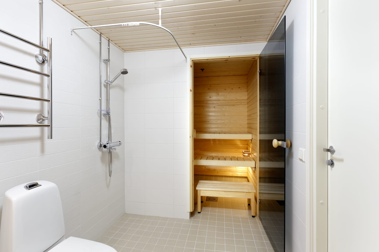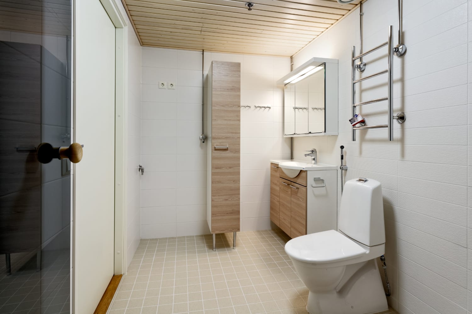 Kodin skandinaavisen seesteinen värimaailma on toteutettu laadukkaasti. Lattiat ovat valkaistua tammilaminaattia ja kylpyhuoneen valkoiseksi kaakeloituja seiniä pehmentää luonnonvalkoinen klinkkerilattia. Keittiökaapistoissa on kaunis vaalea saarnipuukuvio ja tyylikkäät vetimet harjattua metallia. Kalusteväleissä on valkoinen sauvakaakelointi ja työtasot ovat valkoista laminaattia. Varusteina keraaminen liesi, astianpesukone sekä jää-pakastinkaapit, kaikki valkoisia. Sähköiset palovaroittimet ja sprinklerijärjestelmä tuovat lisäturvaa asumiseen.