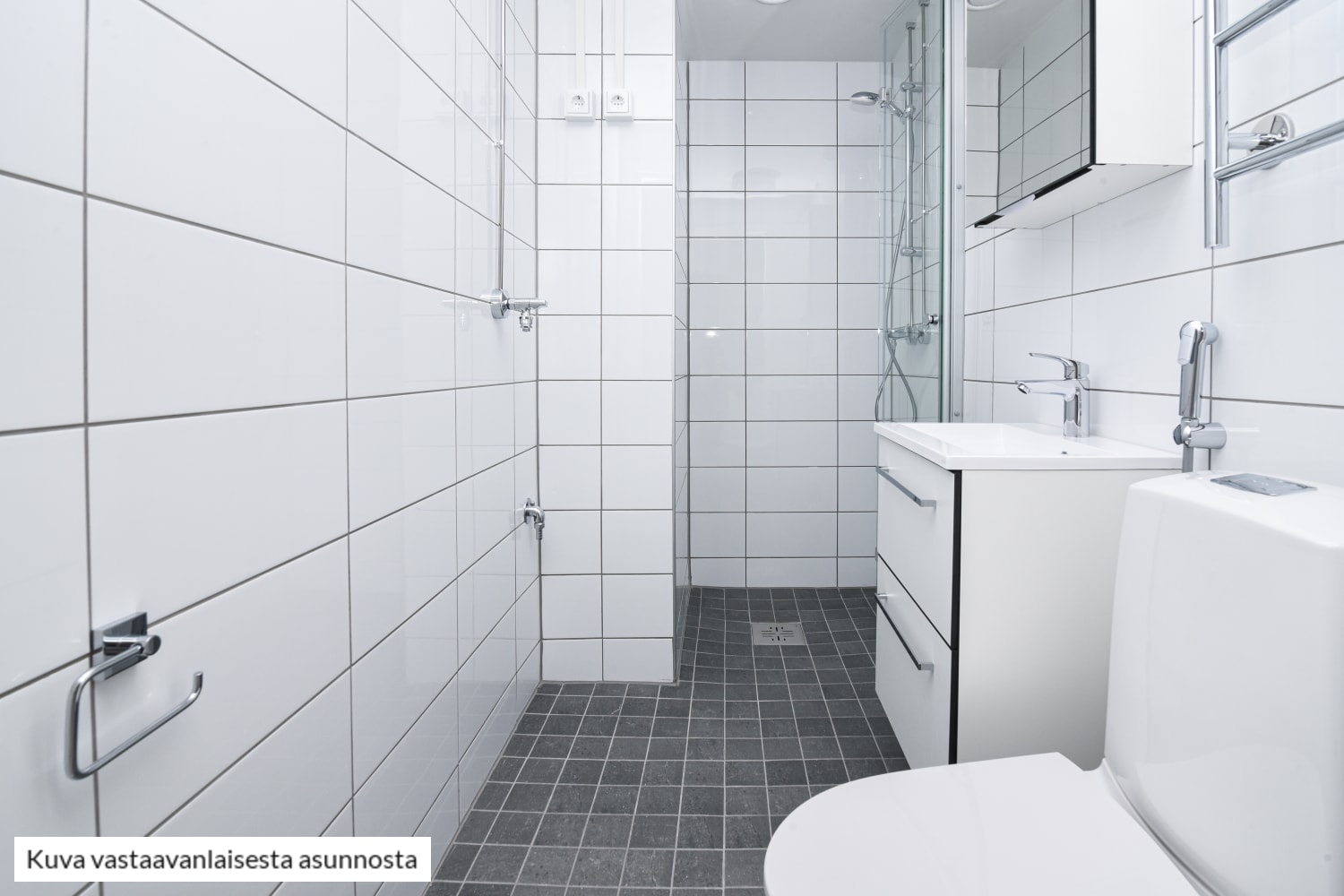 Arjen varma piristys on uutuuttaan hohtava kotikylpylä, jonka seinät ovat valkoista ja lattia harmaata laattaa. Tehopohjaisessa kylpyhuoneessa on tilaa myös pyykkikoneellesi.