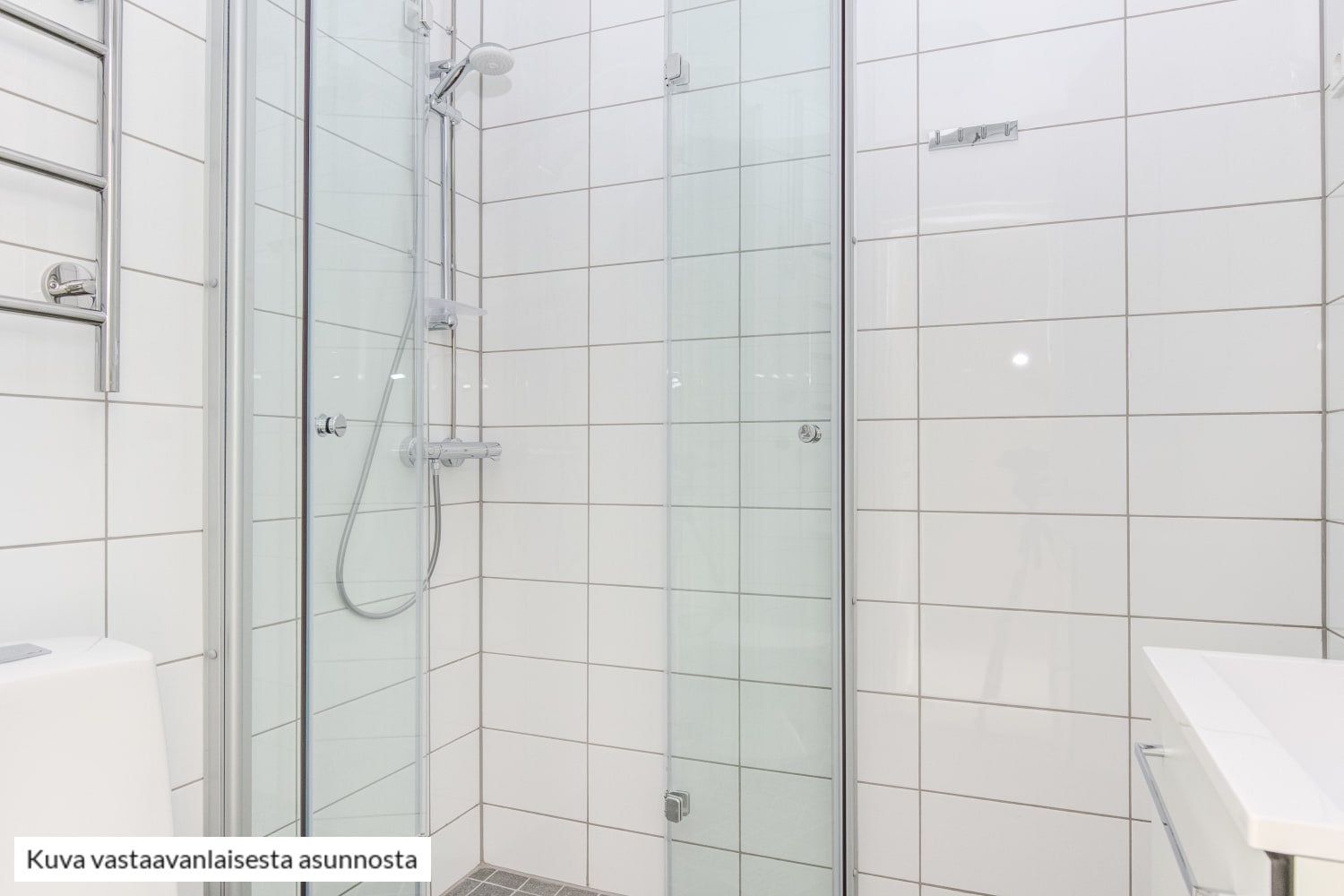 Arjen varma piristys on uutuuttaan hohtava kotikylpylä, jonka seinät ovat valkoista ja lattia harmaata laattaa. Tehopohjaisessa kylpyhuoneessa on tilaa myös pyykkikoneellesi.