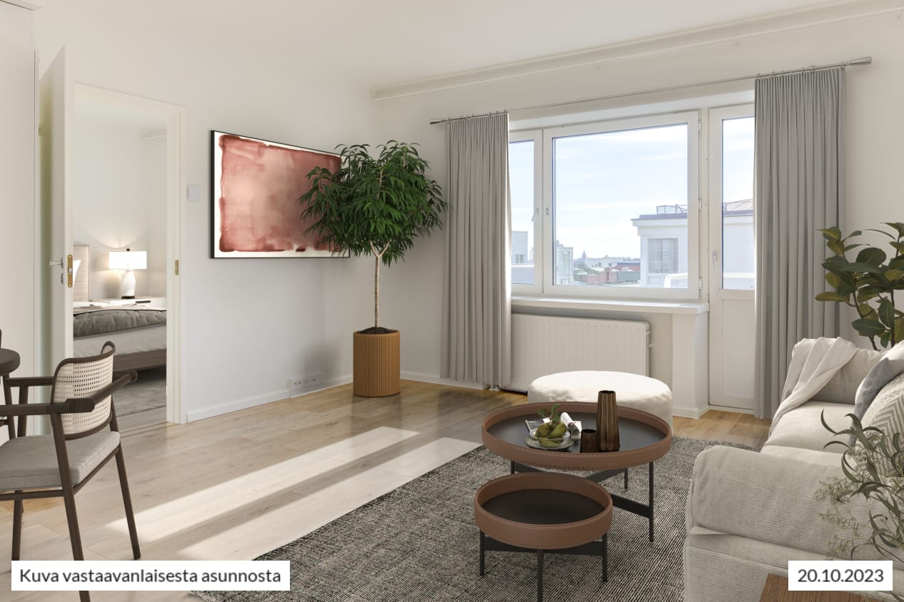 Käytännöllisessä kaksiossa on tehokas pohja ja avarat näkymät lounaaseen Hakaniemeen päin. Keittiötila yhdistyy saumattomasti oleskelutilaan, jonka voit helposti kalustaa juuri sinulle sopivaksi. Säilytystilaa on sekä eteisessä että molemmissa asuinhuoneissa. Syville ikkunalaudoille mahtuu monta viherkasvia ja koriste-esinettä.