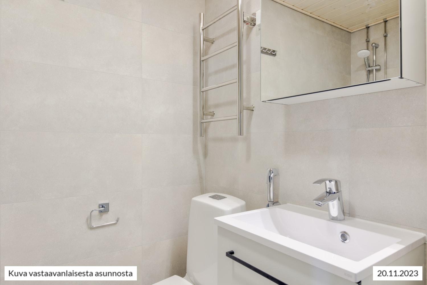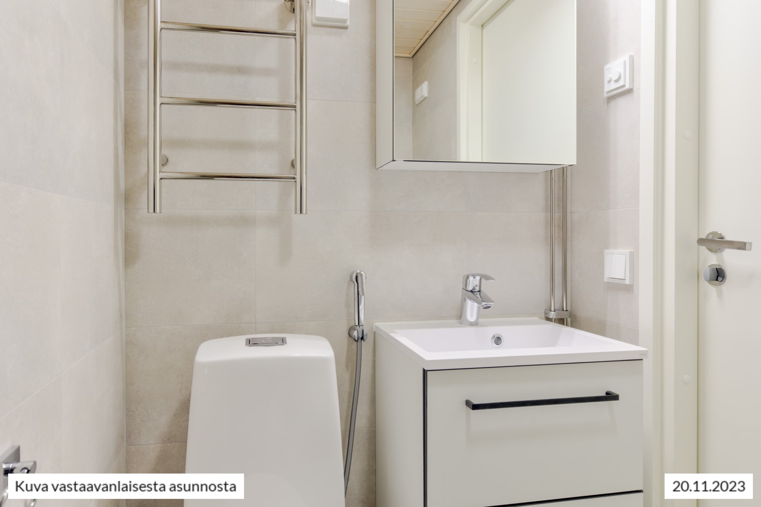 Raikkaan kylpyhuoneen seinät on kaakeloitu eläväpintaisella vaalealla ja lattia harmaalla laatalla. Kestävät, kotimaiset Kide-kylpyhuonekalusteet ovat valkoiset. Myös oma pyykinpesukoneesi mahtuu tähän tilaihmeeseen.