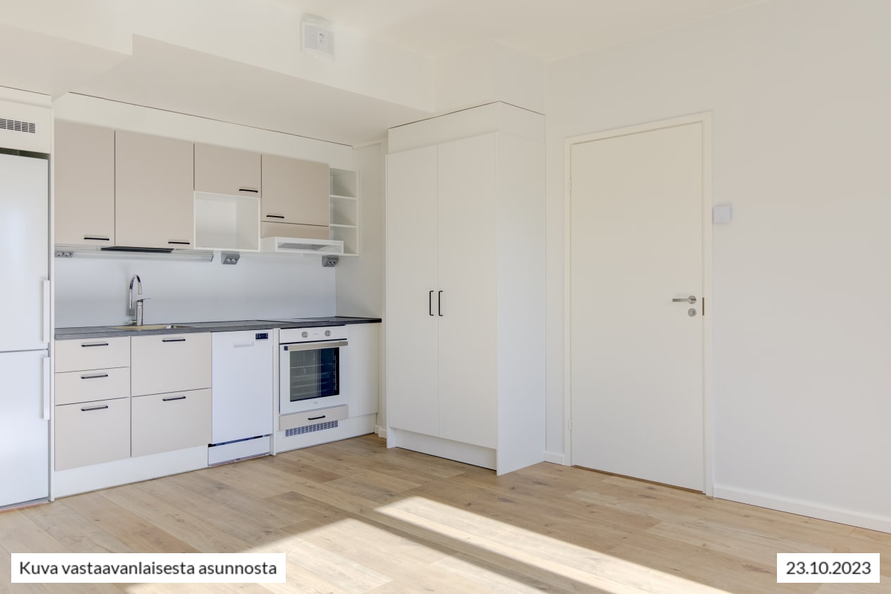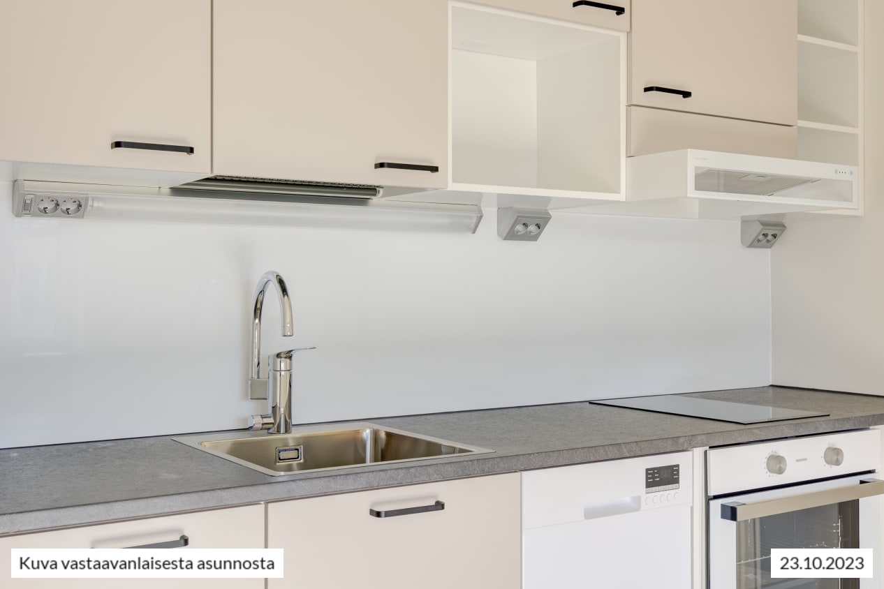 Kokkailu on ilo vuonna 2023 täysin uudistetussa keittiössä: työskentely- ja kaappitilaa on mukavasti, astianpesukone hoitaa tiskit ja induktioliesitaso on helppo pitää puhtaana. Mikrollekin on tilaa. Keittiön neutraali värimaailma sopii moneen tyyliin. Kaapit ovat vaalean beigen väriset, välitila valkoinen ja tasot eläväpintaisen harmaat.