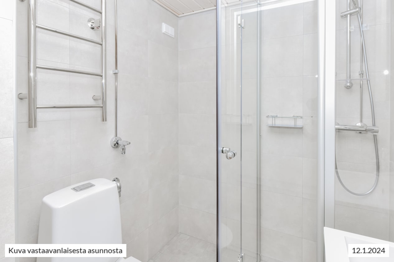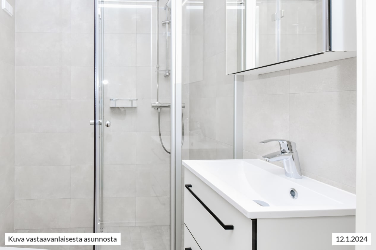 Raikkaan kylpyhuoneen seinät on kaakeloitu eläväpintaisella vaalealla ja lattia harmaalla laatalla. Kestävät, kotimaiset Kide-kylpyhuonekalusteet ovat valkoiset. Myös oma pyykinpesukoneesi mahtuu tähän tilaihmeeseen.