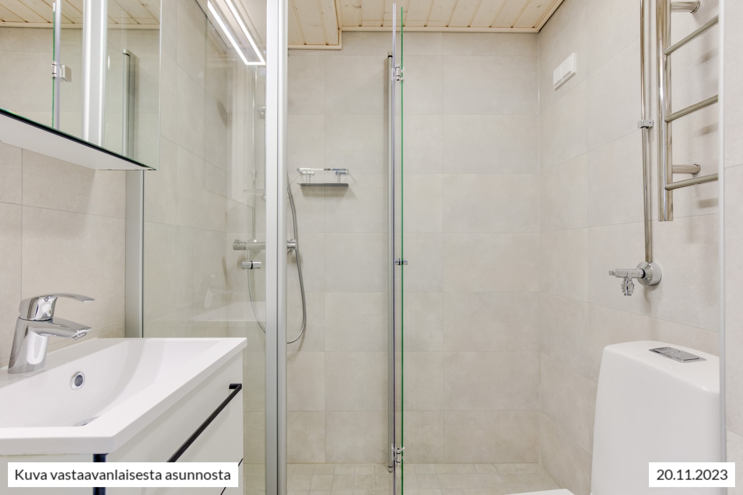 Raikkaan kylpyhuoneen seinät on kaakeloitu eläväpintaisella vaalealla ja lattia harmaalla laatalla. Kestävät, kotimaiset Kide-kylpyhuonekalusteet ovat valkoiset. Myös oma pyykinpesukoneesi mahtuu tähän tilaihmeeseen.