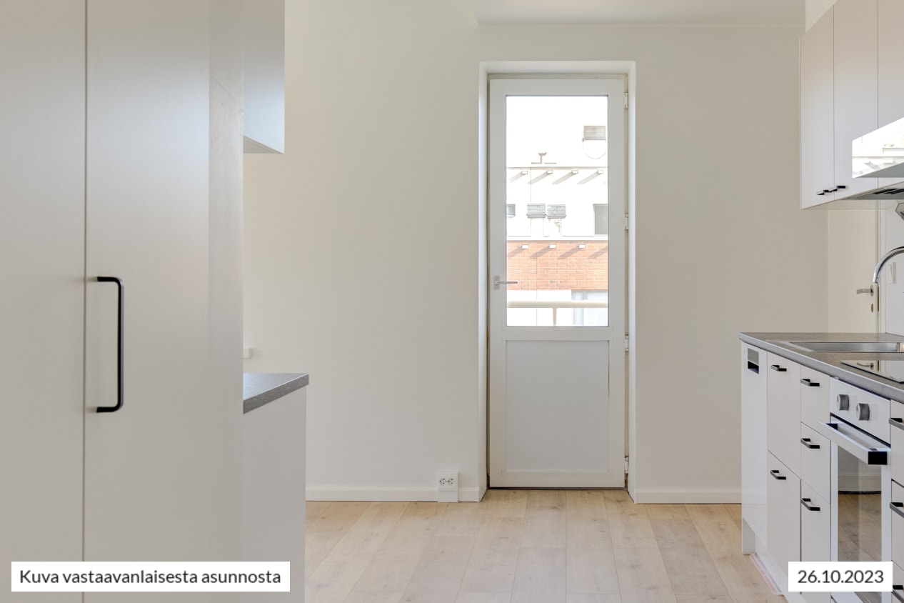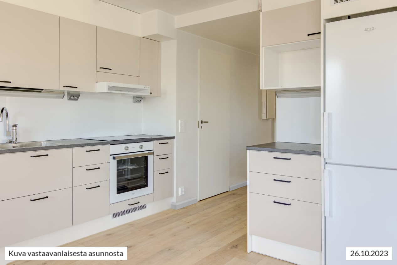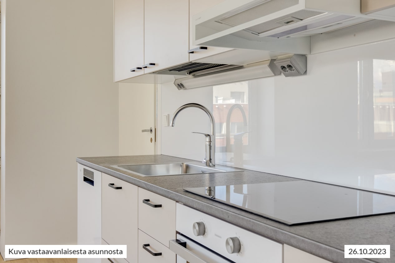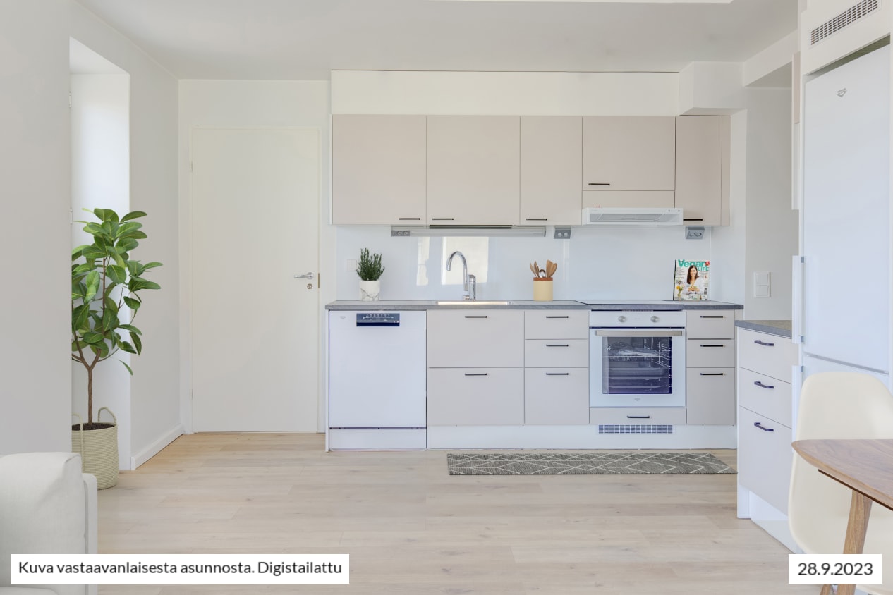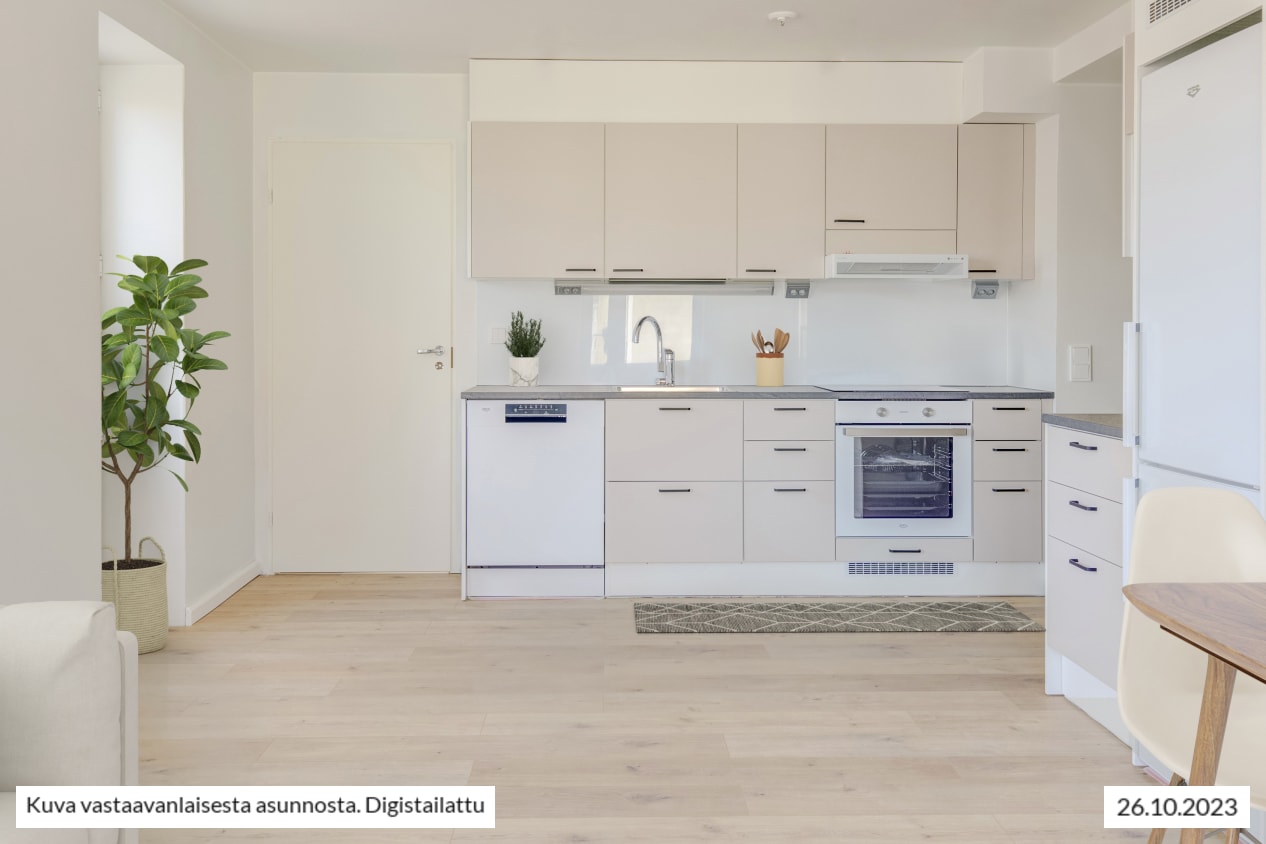 Kokkailu on ilo vuonna 2023 täysin uudistetussa keittiössä, joka on sopivasti hieman erillään olohuoneesta: työskentely- ja kaappitilaa on mukavasti, astianpesukone hoitaa tiskit ja induktioliesitaso on helppo pitää puhtaana. Mikrollekin on tilaa. Keittiön neutraali värimaailma sopii moneen tyyliin. Kaapit ovat vaalean beigen väriset, välitila valkoinen ja tasot eläväpintaisen harmaat.