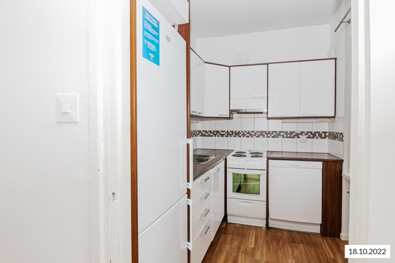 Keittiössä on jää-pakastinkaappi ja nelilevyinen liesi.