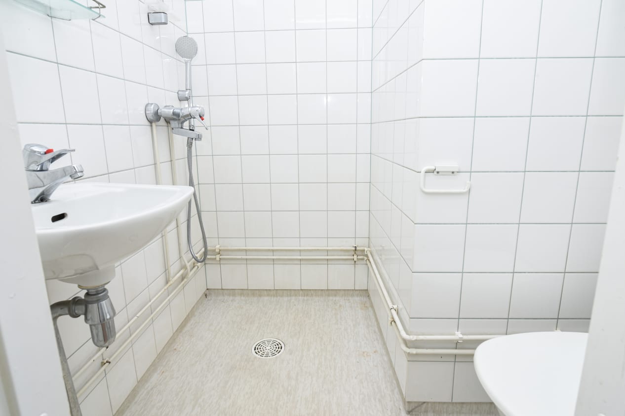 Kylpyhuoneessa kalusteet ovat SATOlle suunniteltua Kide-mallistoa. Kalusteiden väri on valkoinen. Malliston massiivilaminaattia olevat kalusteet on valmistettu Suomessa. Kylpyhuoneen seinät ovat valkoista laattaa ja lattian laatoituksen sävy on harmaa. Kylpyhuoneessa on tilavaraus ja liitännät pyykinpesukoneelle.