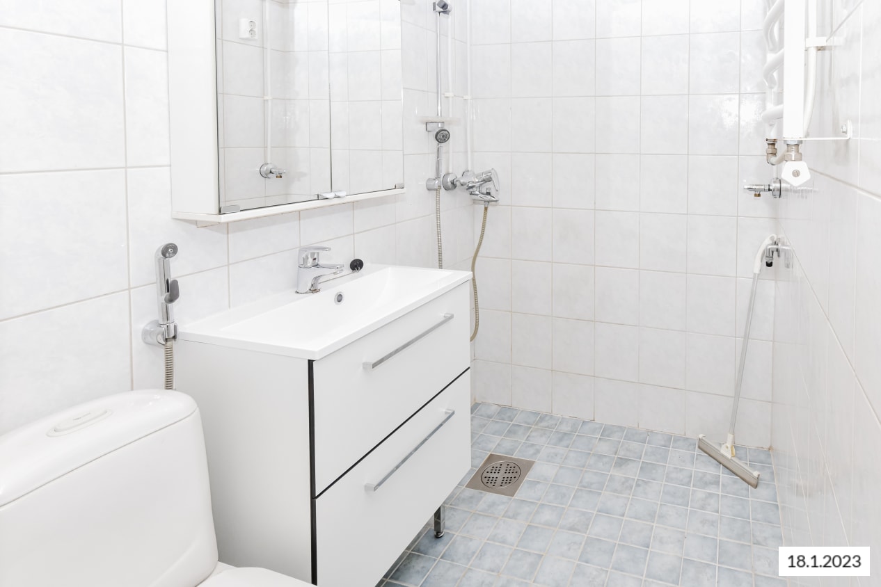 Asuinhuoneiden lattiamateriaalina on parketti ja lattialämmitetty kylpyhuone on kauttaaltaan kaakeloitu. Keittokomerossa on pakastelokerollinen jääkaappi.