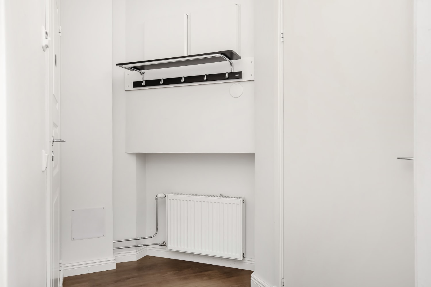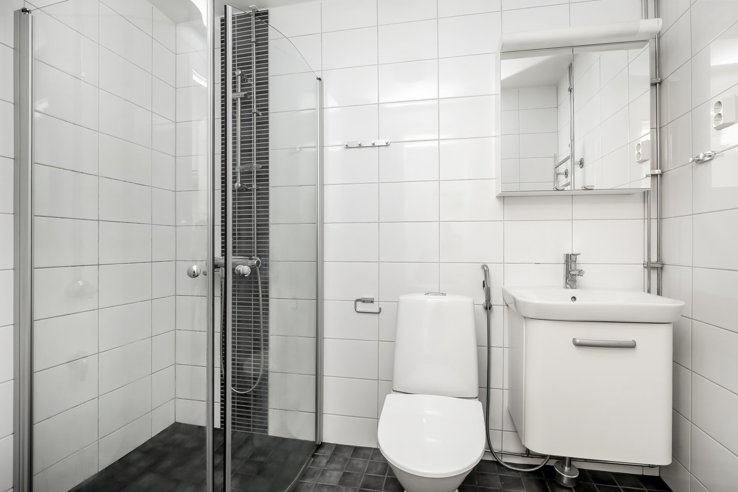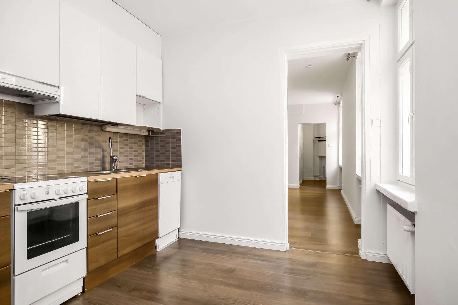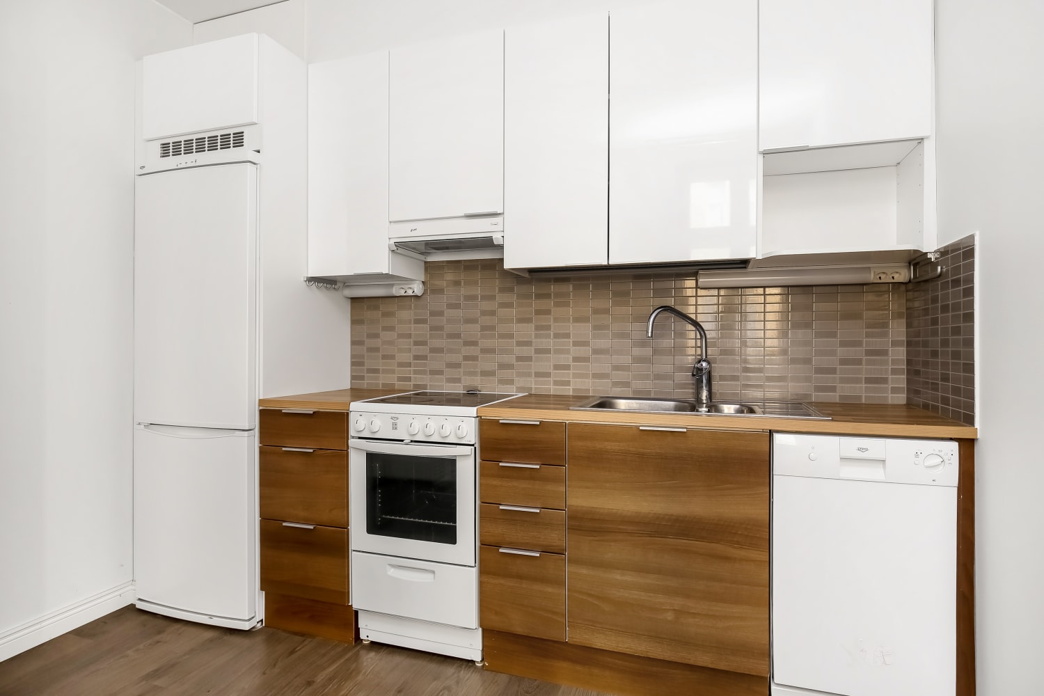Asunnossa on persoonalliset, viileän harmaaseen vivahtavat tammilaminaattilattiat. Kylpyhuoneessa on lattialämmitys, eläväpintaiset antrasiitinharmaat lattialaatat ja seinät kiiltävän valkoista kaakelia. Suihkun kohdalla tyylikkäänä tehosteena on pehmeän harmaa pystyboordi. Keittiössä on sileät valkoiset yläkaapistot ja alakaapeissa utuisen ruskea pähkinäpuukuvioinen pinta. Työtasot ovat pähkinäpuukuvioista laminaattia vanerikuvioisin reunoin. Kodin varusteisiin kuuluvat jää-pakastinkaappi, astianpesukone ja keraaminen liesi, kaikki valkoisia.