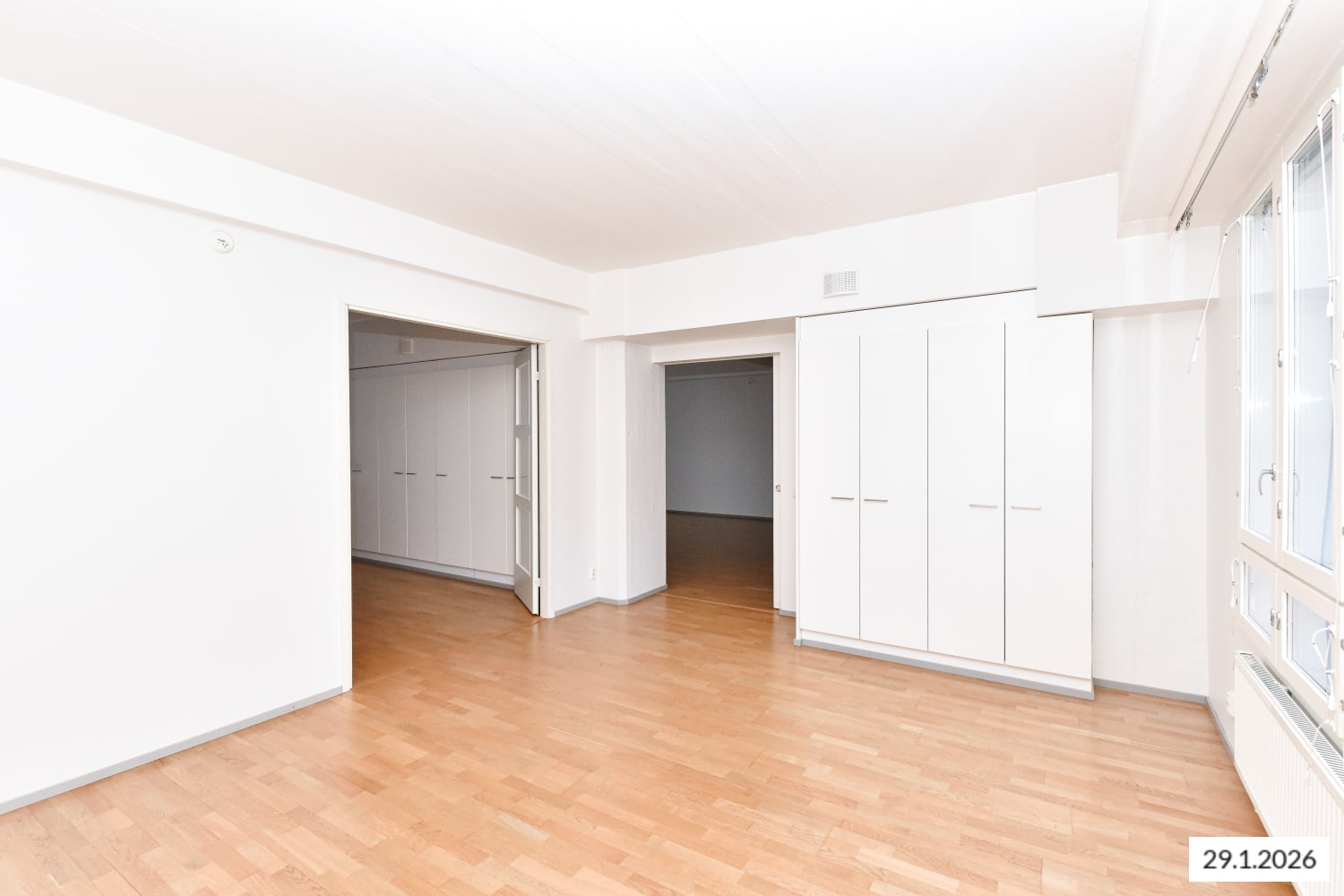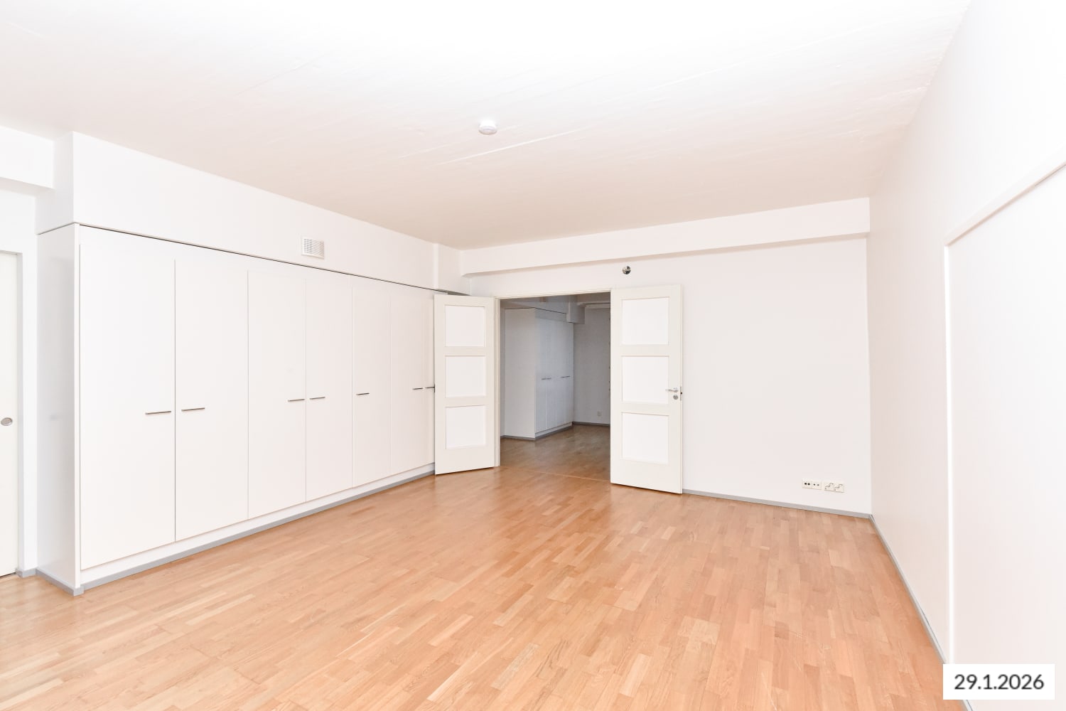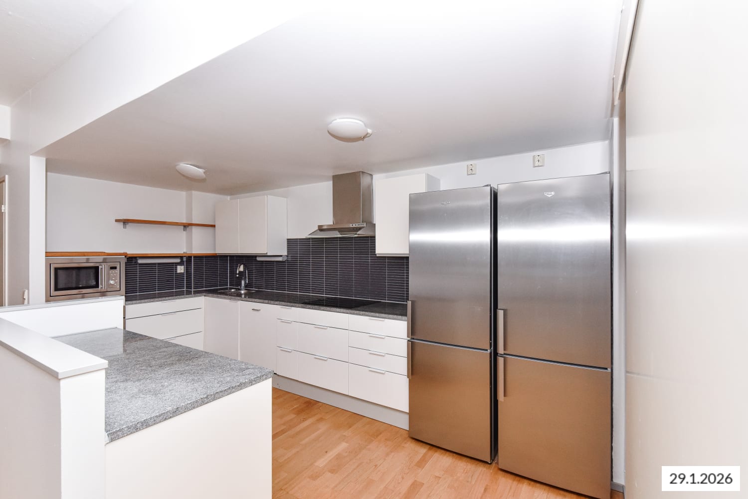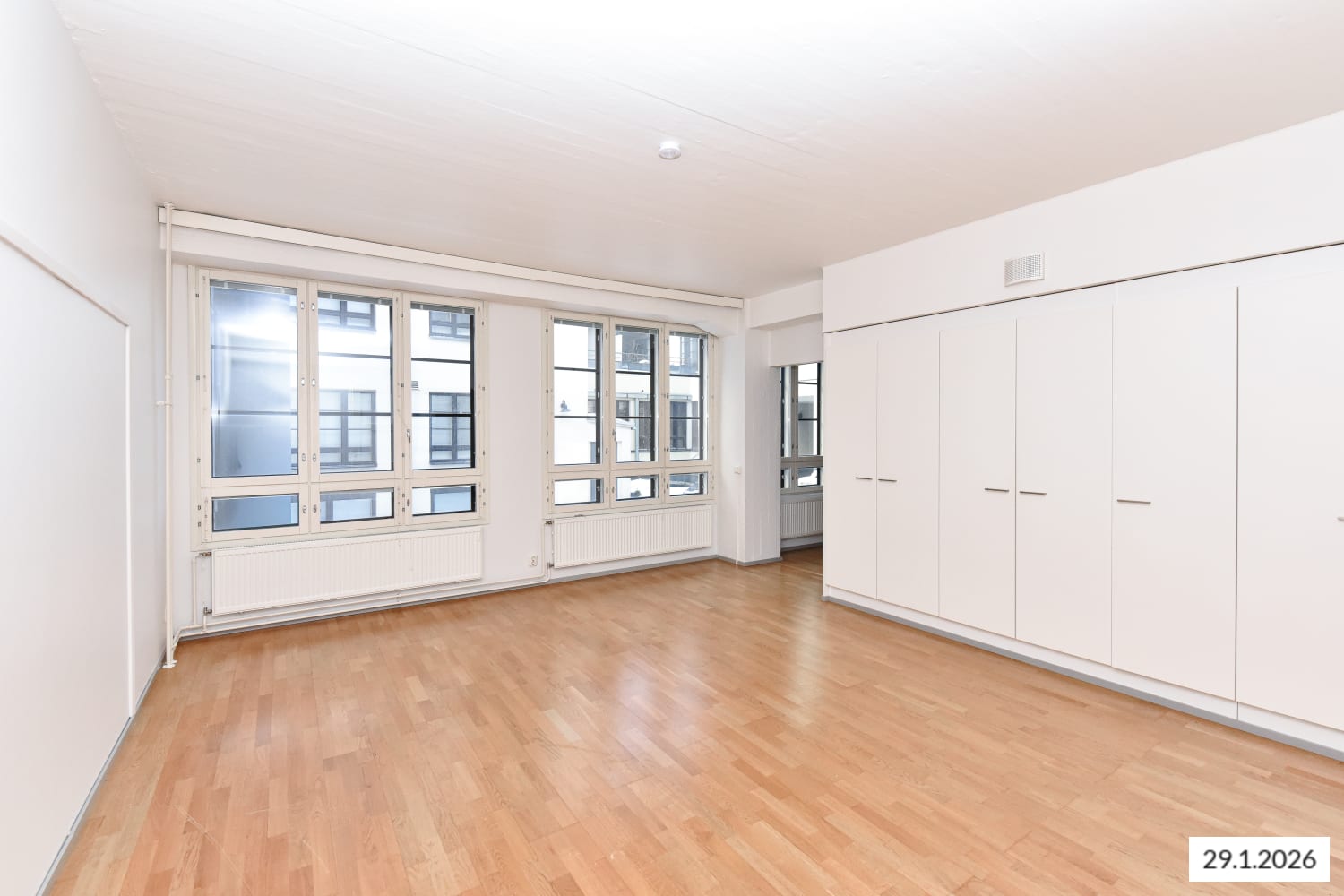 Komean kaupunkikodin keskipisteenä on upea olohuone, jonka ilmavuutta lisäävät isot moniruutuiset ikkunat. Eleettömän kaunis keittiö lisää tilan loft-tyyppistä tunnelmaa ja mahdollistaa huoneiston käyttämisen myös edustusasuntona. Asuinhuoneiden lattiat ovat tammiparkettia.