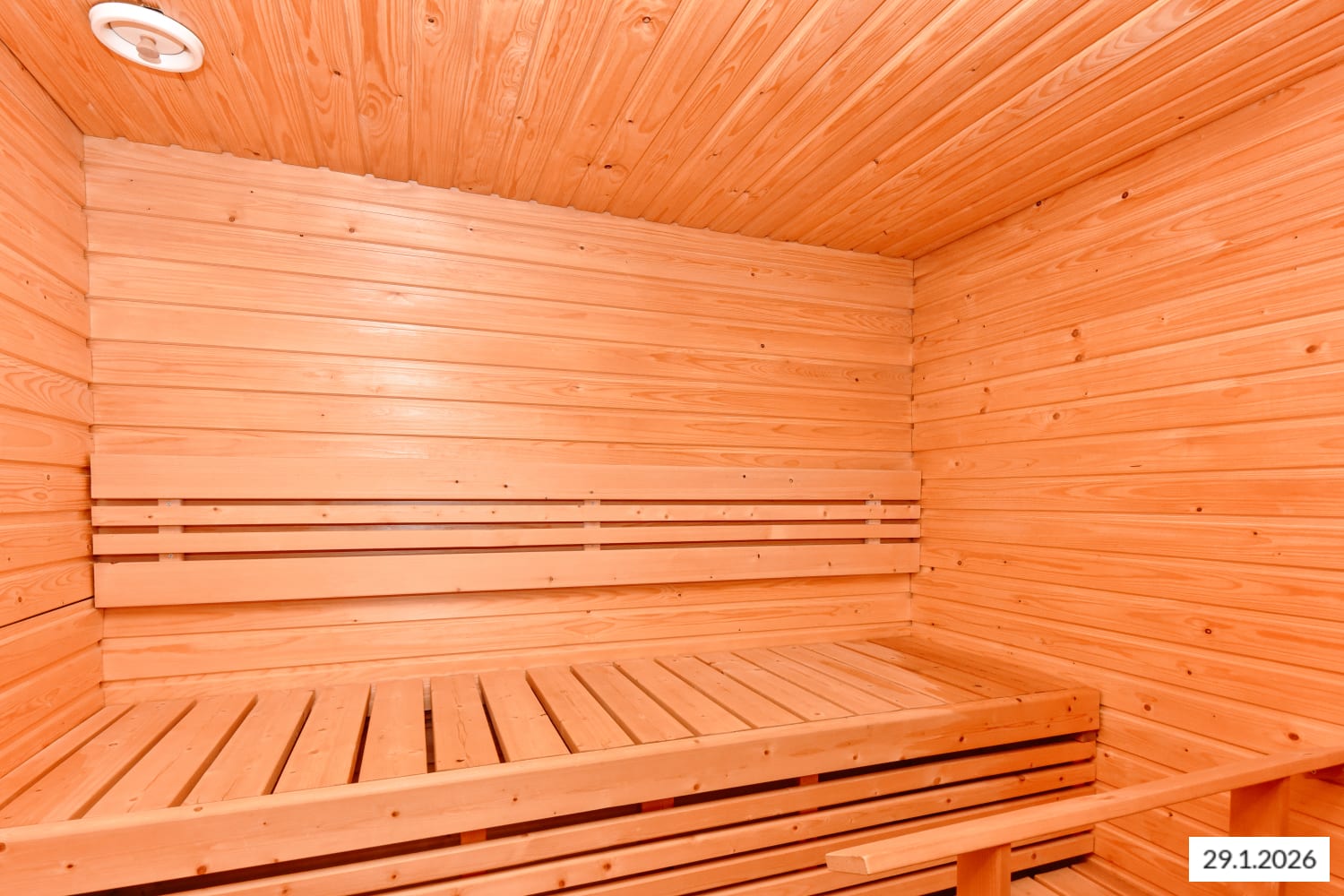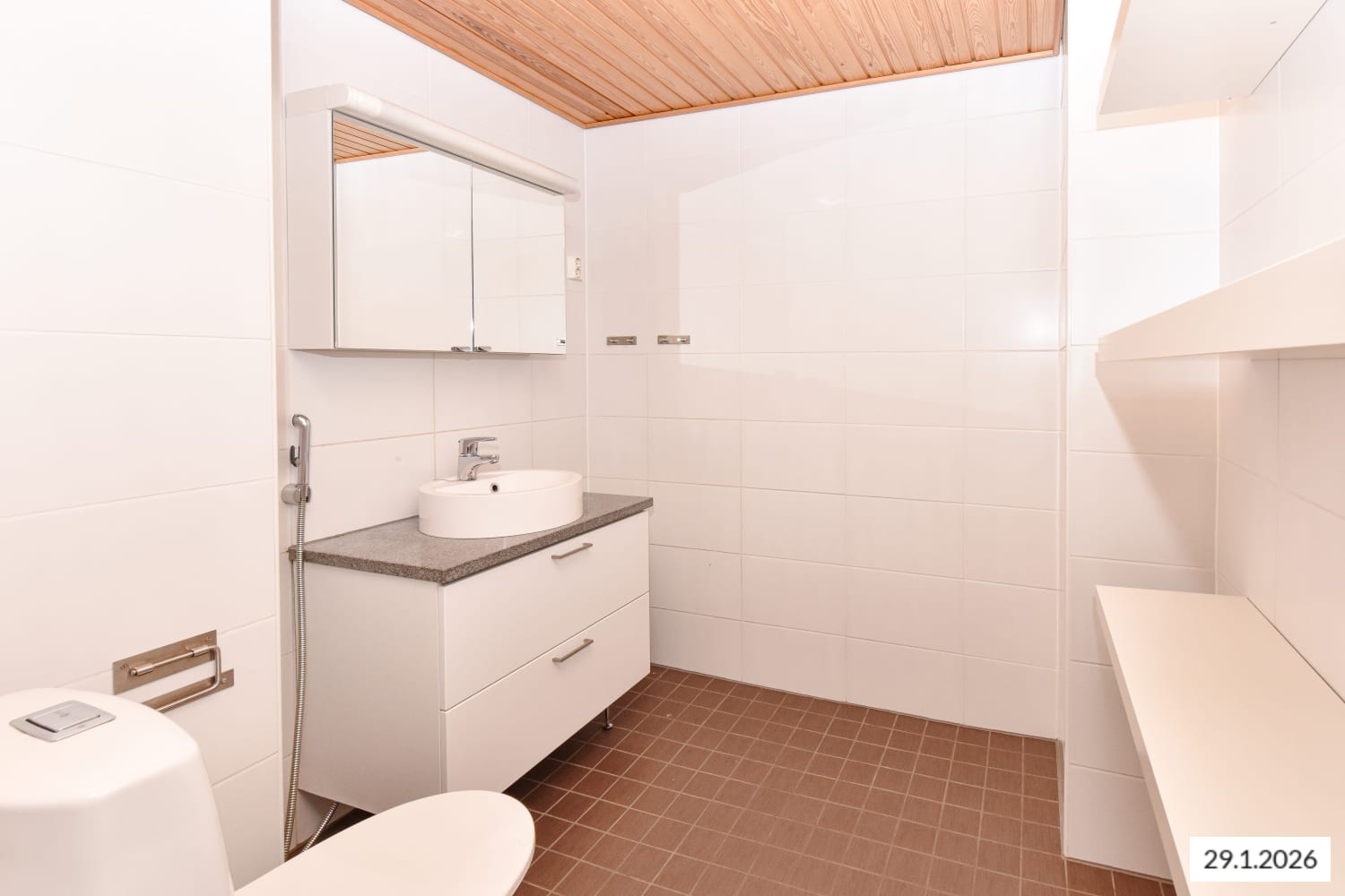 Kylpyhuoneessa on vaakaan ladottu iso valkoinen seinäkaakeli, hillitty tummanruskea laattalattia ja mukavuuslattialämmitys. Saunassa käytetty puu on suomalaista kuusta.
