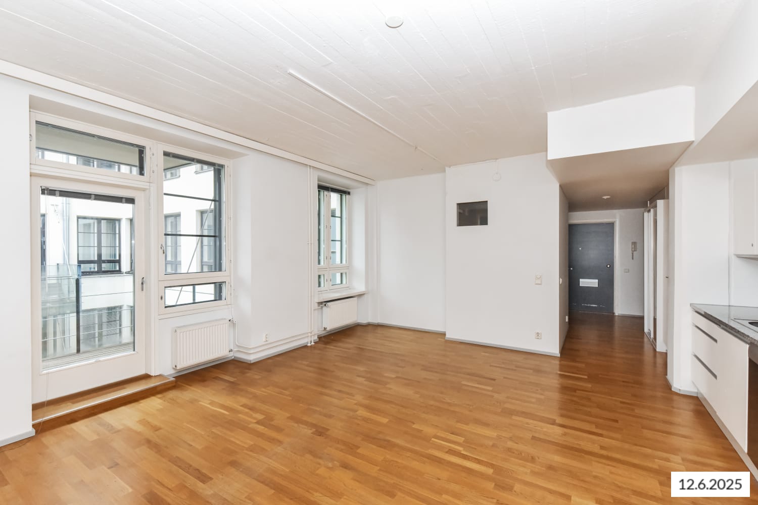Keskustan tuntumassa sijaitsevassa kaksiossa on kivetyn sisäpihan puolelle avautuva parveke ja ylellisen iso kylpyhuone. Tilavaan tupakeittiöön saa mahtumaan kookkaammankin kalustuksen ja makuuhuoneen sisustamista helpottaa liukuovi.