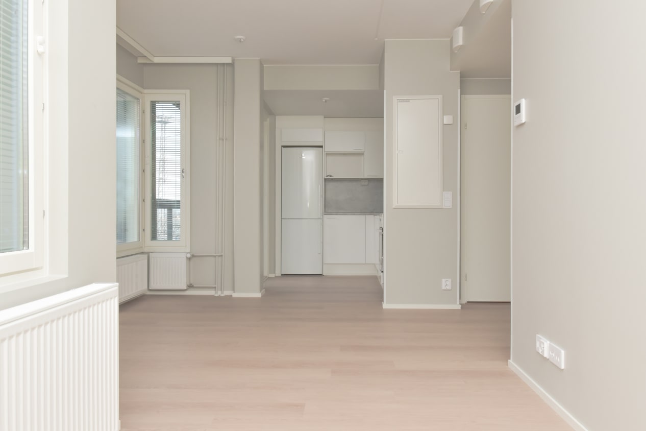 Ihan uuden, vaaleasävyisen yksiön keittiötila ja olohuone muodostavat yhtenäisen oleskelualueen, jonka jatkeena on lasitettu parveke. Ikkunalliseen alkoviin sisustat viihtyisän makuutilan omaan rauhaansa. Kodin lattia on vaaleaa tammilaminaattia ja seinät on maalattu vaalealla harmaalla. Keittiökaapistot ovat raikkaan valkoiset ja ylä- ja alakaappien välinen tila sekä työtaso ovat harmaata laminaattia. Varustukseen kuuluu astianpesukone, keraaminen liesi ja jääkaappipakastin. Kylpyhuoneessa on valkoiset SATOn Kide-malliston kalusteet. Seinät ovat valkoista laattaa ja lattia on harmaa. Pesukoneelle ja kuivausrummulle on paikka. Eteisen kaapistossa on peiliovet.