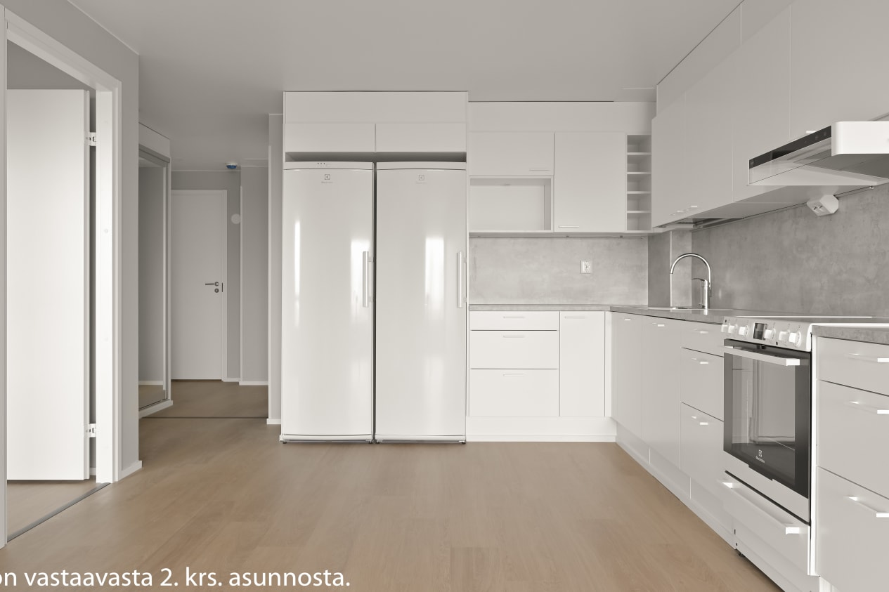Upouusi läpitalon huoneisto on sävyiltään tyylikkään skandinaavinen ja kalustat omaan makusi sopivan kodin helposti. Avoin keittiötila ja olohuone yhdistyvät avaraksi oleskelualueeksi ja tila jatkuu suojaiselle lasitetulle parvekkeelle, josta on näkymä merelle. Kodin lattia on vaaleaa tammilaminaattia ja seinät on maalattu vaalealla harmaalla. Keittiökaapistot ovat raikkaan valkoiset ja ylä- ja alakaappien välinen tila sekä työtaso ovat harmaata laminaattia. Varustukseen kuuluu astianpesukone, keraaminen liesi ja korkea jääkaappi ja pakastin. Ikkunallisessa kylpyhuoneessa on valkoiset SATOn Kide-malliston kalusteet. Seinät ovat valkoista laattaa ja lattia on harmaa. Pesukoneelle ja kuivausrummulle on paikka. Eteisen kaapistossa on peiliovet.