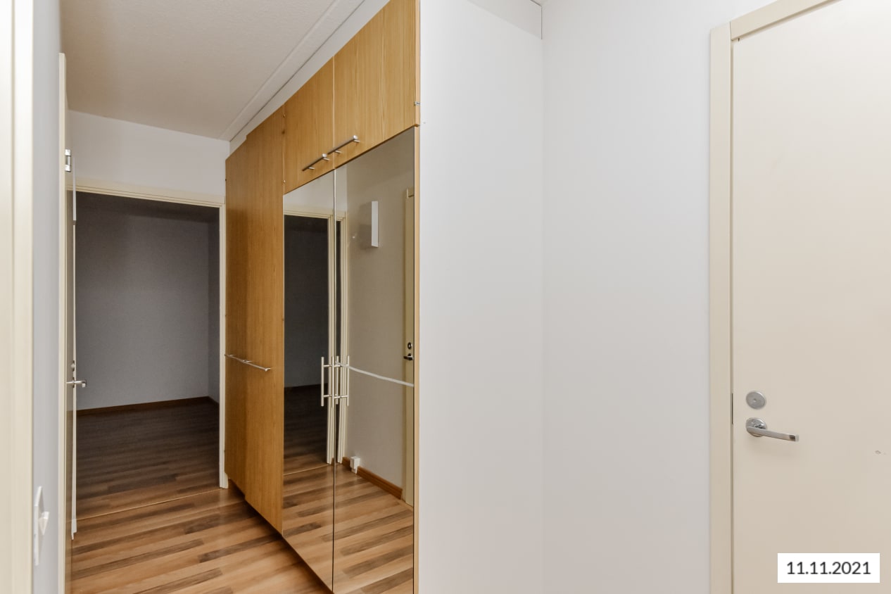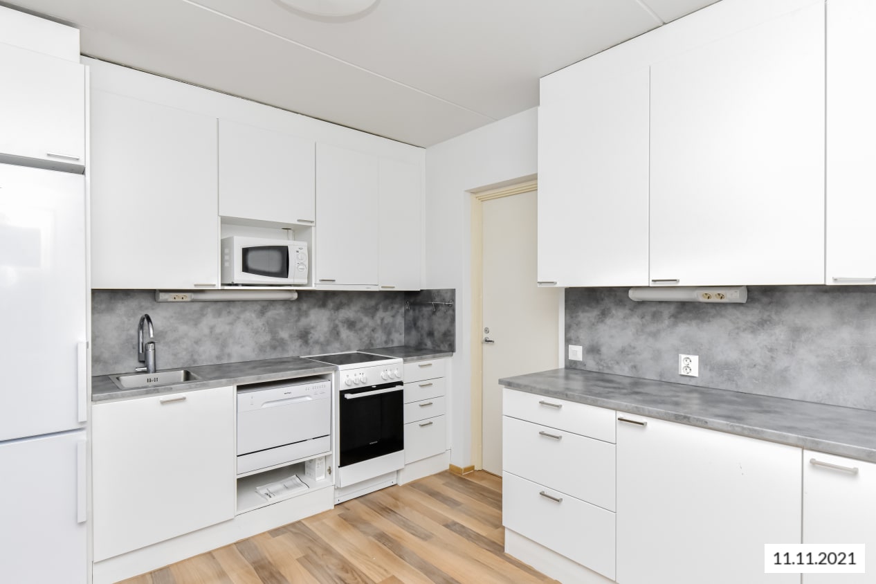 Asuinhuoneiden lattiamateriaalina on tyylikäs tummempi laminaatti. Kylpyhuoneen lattiassa on siniharmaa laatoitus ja seinissä valkoinen kaakelointi. Valoisassa keittiössä on valkoiset puukehyksiset kaapistot, jää-pakastinkaappi sekä nelilevyinen sähköliesi.