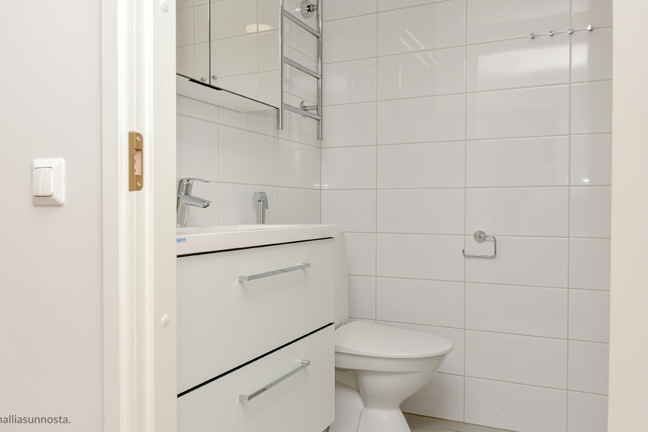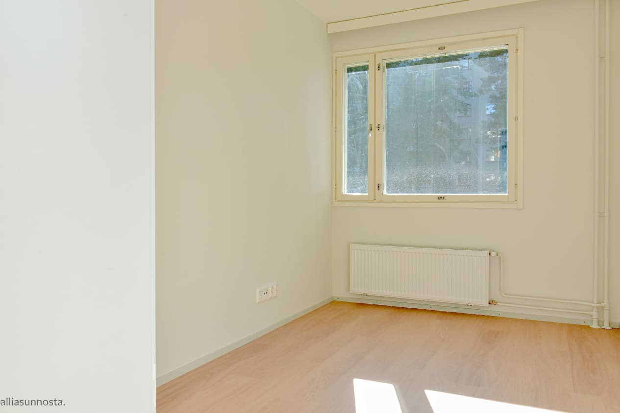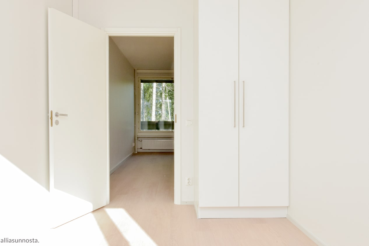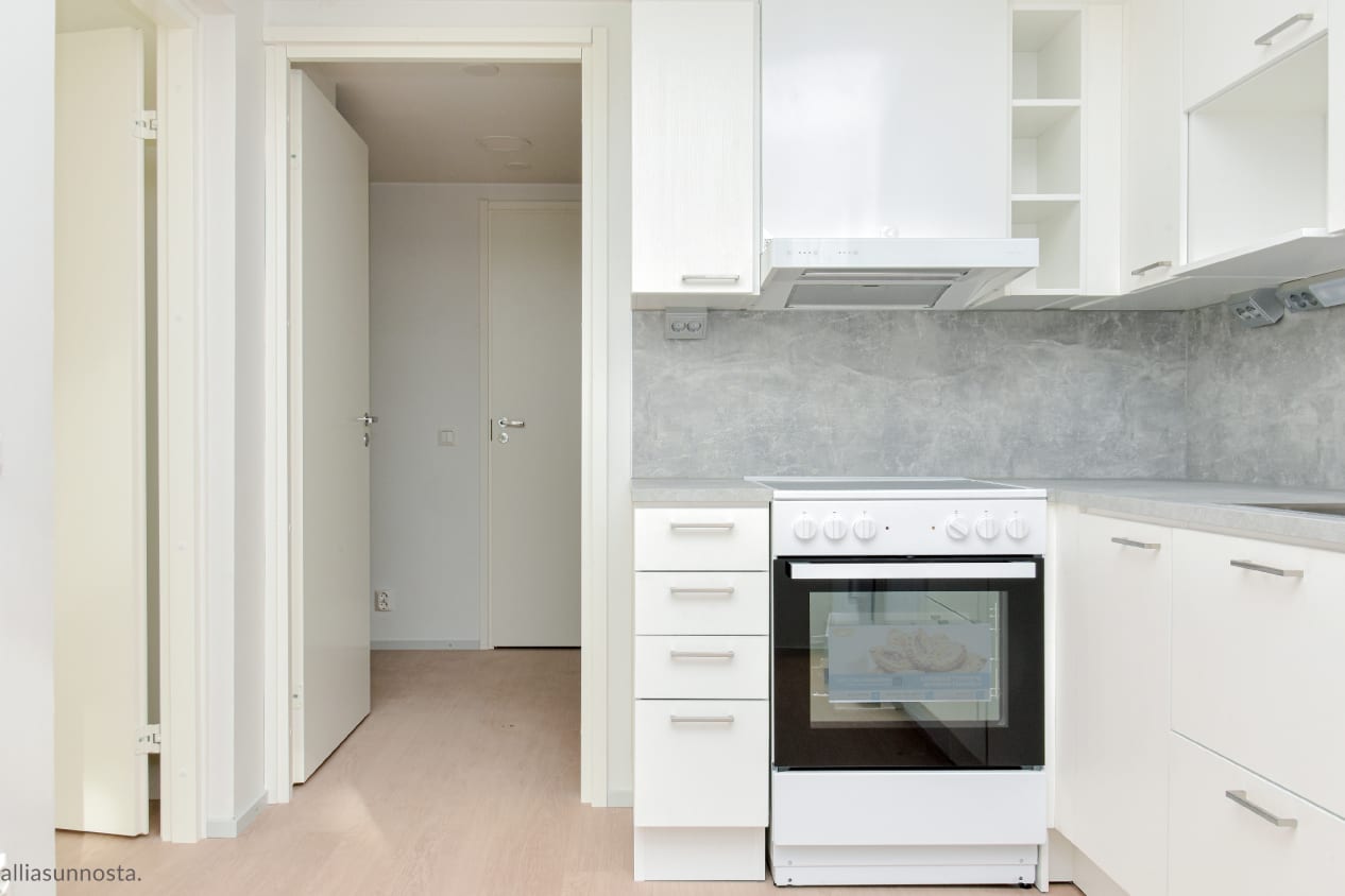Remontoidun, valoisan kodin ikkunat aukeavat kahteen ilmansuuntaan ja sisustat sen helposti omaksi kodiksi. Lattia on vaaleaa tammilaminaattia ja seinät on maalattu valkoisiksi. Asunnon olohuone on avara ja suurin makuuhuone on erotettu siitä pariovin. Suojaisa, lasitettu parveke avautuu ilta-auringon puolelle. Erillisessä keittiössä kotikokki mahtuu puuhailemaan ja tilaan sopii myös kunnollinen ruokapöytä. Keittiön kaapistot ovat raikkaan valkoiset ja ylä- ja alakaappien välinen tila sekä työtaso ovat harmaata laminaattia. Varustukseen kuuluu keraaminen liesi, liesikupu, jääkaappipakastin ja astianpesukone. Kodinkoneet ovat valkoisia. Kylpyhuoneessa ja erillisessä wc:ssä on valkoiset SATOn Kide-malliston kalusteet. Seinät ovat valkoista laattaa ja lattia on harmaa. Pyykinpesukoneelle löytyy oma paikka kylpyhuoneesta.