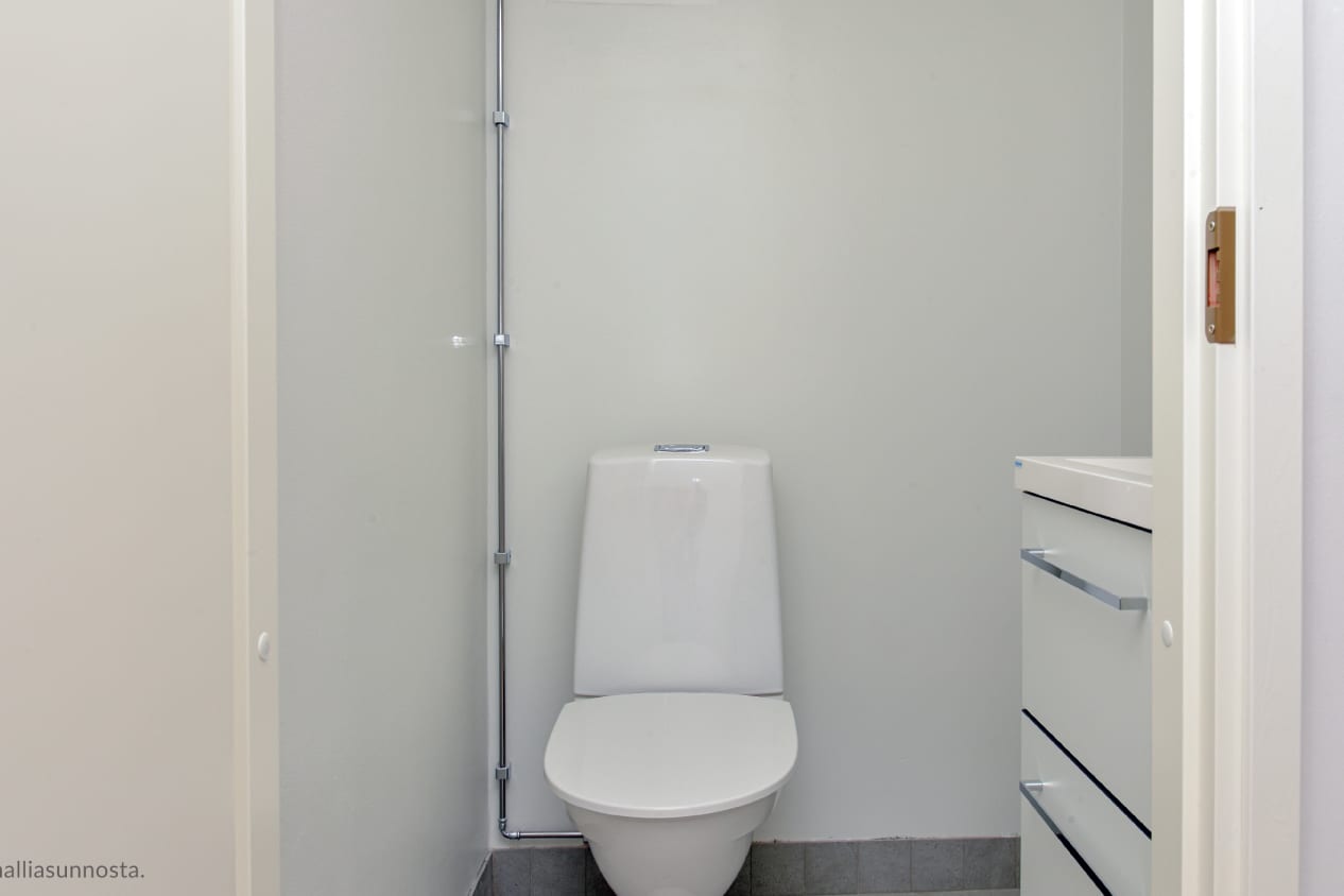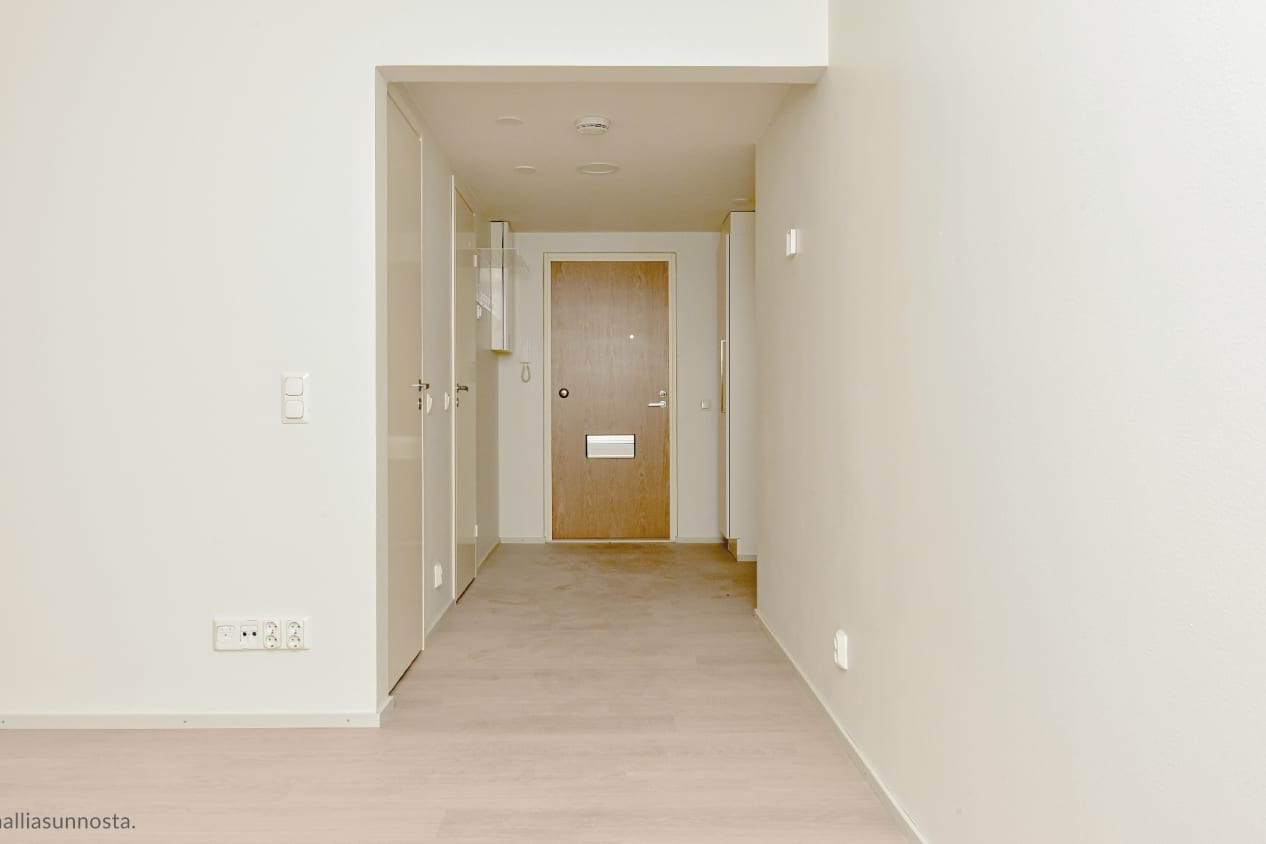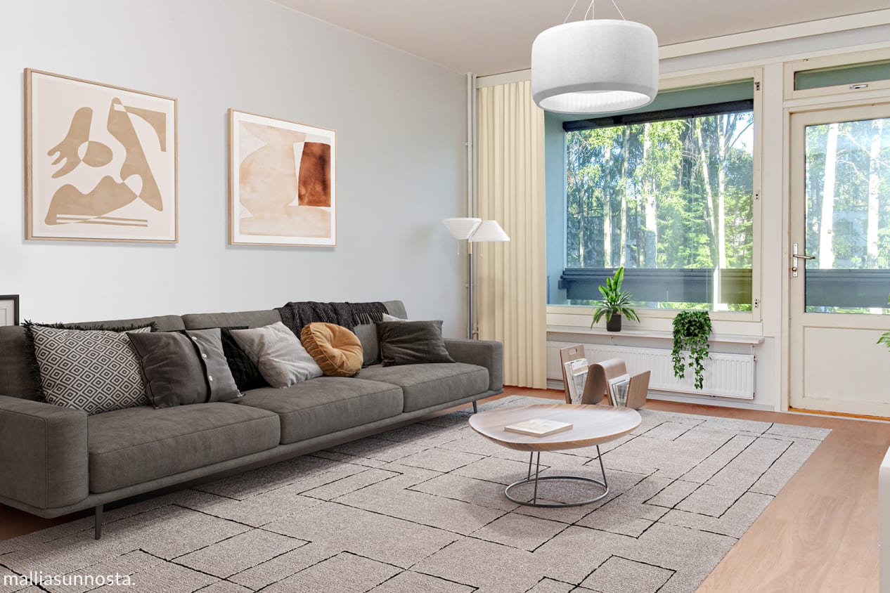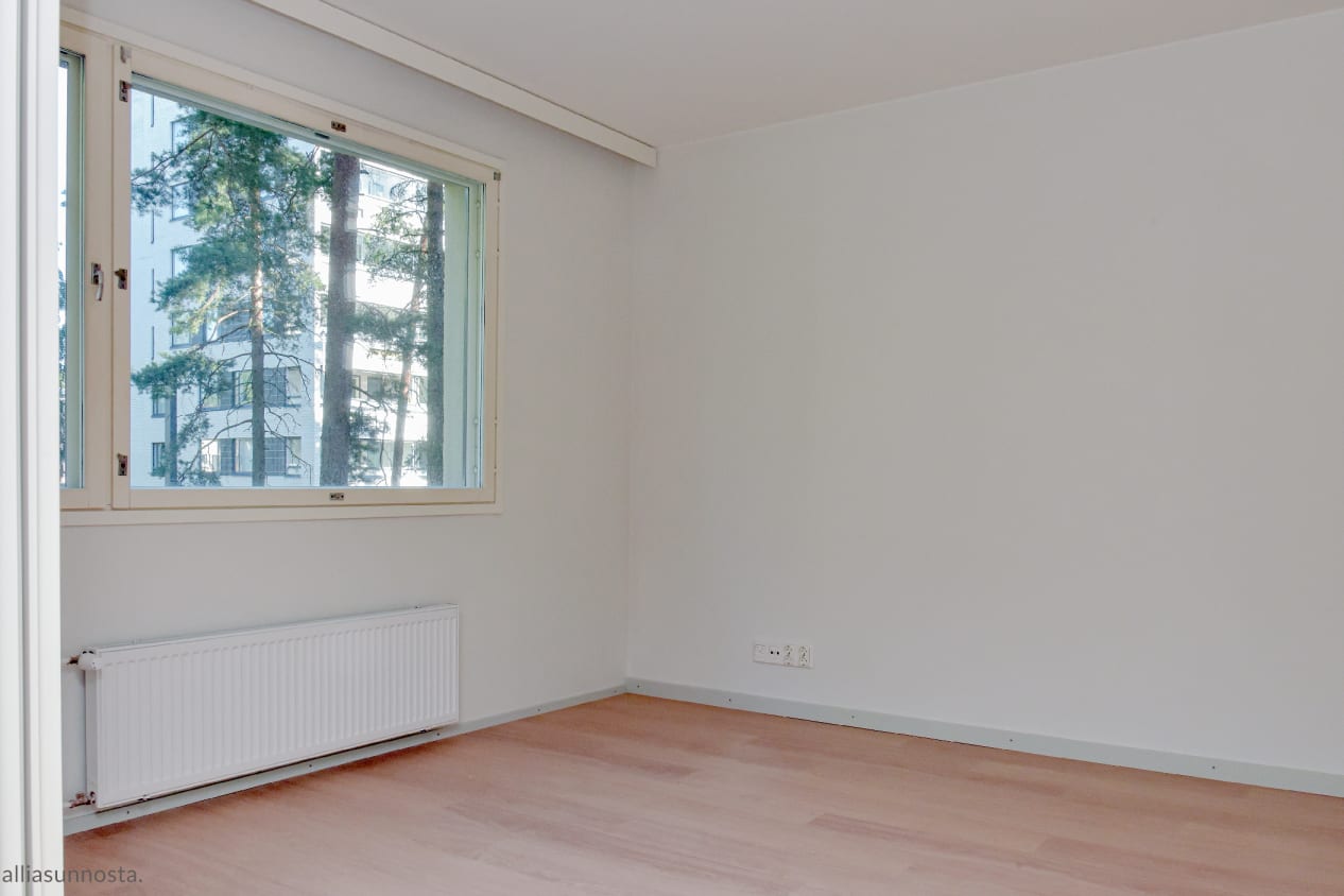 Remontoidun, valoisan kodin ikkunat aukeavat kahteen ilmansuuntaan ja sisustat sen helposti omaksi kodiksi. Lattia on vaaleaa tammilaminaattia ja seinät on maalattu valkoisiksi. Asunnon olohuone on avara ja suurin makuuhuone on erotettu siitä pariovin. Suojaisa, lasitettu parveke avautuu ilta-auringon puolelle. Erillisessä keittiössä kotikokki mahtuu puuhailemaan ja tilaan sopii myös kunnollinen ruokapöytä. Keittiön kaapistot ovat raikkaan valkoiset ja ylä- ja alakaappien välinen tila sekä työtaso ovat harmaata laminaattia. Varustukseen kuuluu keraaminen liesi, liesikupu, jääkaappipakastin ja astianpesukone. Kodinkoneet ovat valkoisia. Kylpyhuoneessa ja erillisessä wc:ssä on valkoiset SATOn Kide-malliston kalusteet. Seinät ovat valkoista laattaa ja lattia on harmaa. Pyykinpesukoneelle löytyy oma paikka kylpyhuoneesta.