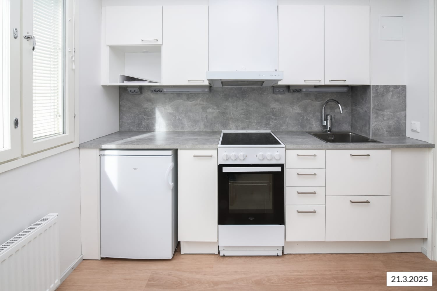 Remontoidun, selkeällä tilaratkaisulla varustetun yksiön kalustat helposti omaksi kodiksi. Lattia on vaaleaa tammilaminaattia ja seinät on maalattu valkoisiksi. Isot, vehreän pihan puolelle avautuvat ikkunat ja ranskalainen parveke tuovat tilaan ilmavuutta ja valoa. Erillisessä keittiössä mahtuu kokkailun lisäksi mukavasti ruokailemaan. Keittiön kaapistot ovat raikkaan valkoiset ja ylä- ja alakaappien välinen tila sekä työtaso ovat harmaata laminaattia. Varustukseen kuuluu keraaminen liesi, liesikupu ja jääkaappi. Kodinkoneet ovat valkoisia. Kylpyhuoneessa on valkoiset SATOn Kide-malliston kalusteet. Seinät ovat valkoista laattaa ja lattia on harmaa. Pyykinpesukoneelle löytyy oma paikka.