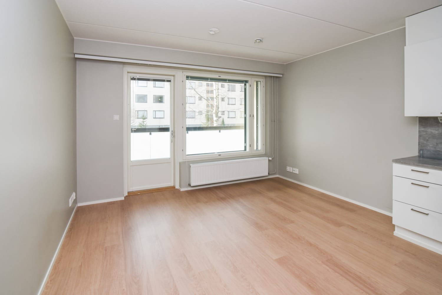 Uuden uutukainen yksiö viehättää avoimella selkeydellään, johon ilmavuutta ja lisätilaa tuo reilunkokoinen lasitettu parveke, joka avautuu ilta-auringon puolelle. Eteisessä on reilusti säilytystilaa erillisessä varastossa. Ikkunassa on sälekaihtimet valmiina. Lattia on vaaleaa tammilaminaattia ja seinät on maalattu vaalean harmaalla. Keittiökaapistot ovat raikkaan valkoiset ja ylä- ja alakaappien välinen tila sekä työtaso ovat harmaata laminaattia. Varustukseen kuuluu astianpesukone, keraaminen liesi ja jääkaappipakastin. Kylpyhuoneessa on valkoiset SATOn Kide-malliston kalusteet. Seinät ovat valkoista laattaa ja lattia on harmaa. Pesukoneelle ja kuivausrummulle on paikka.