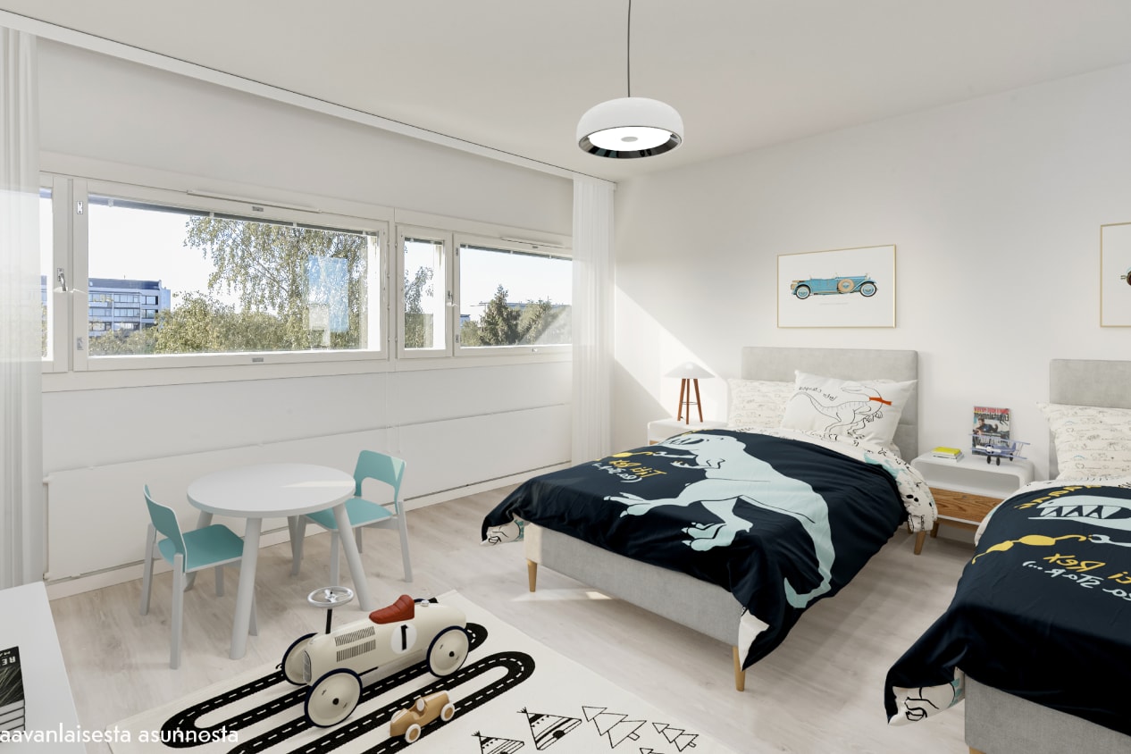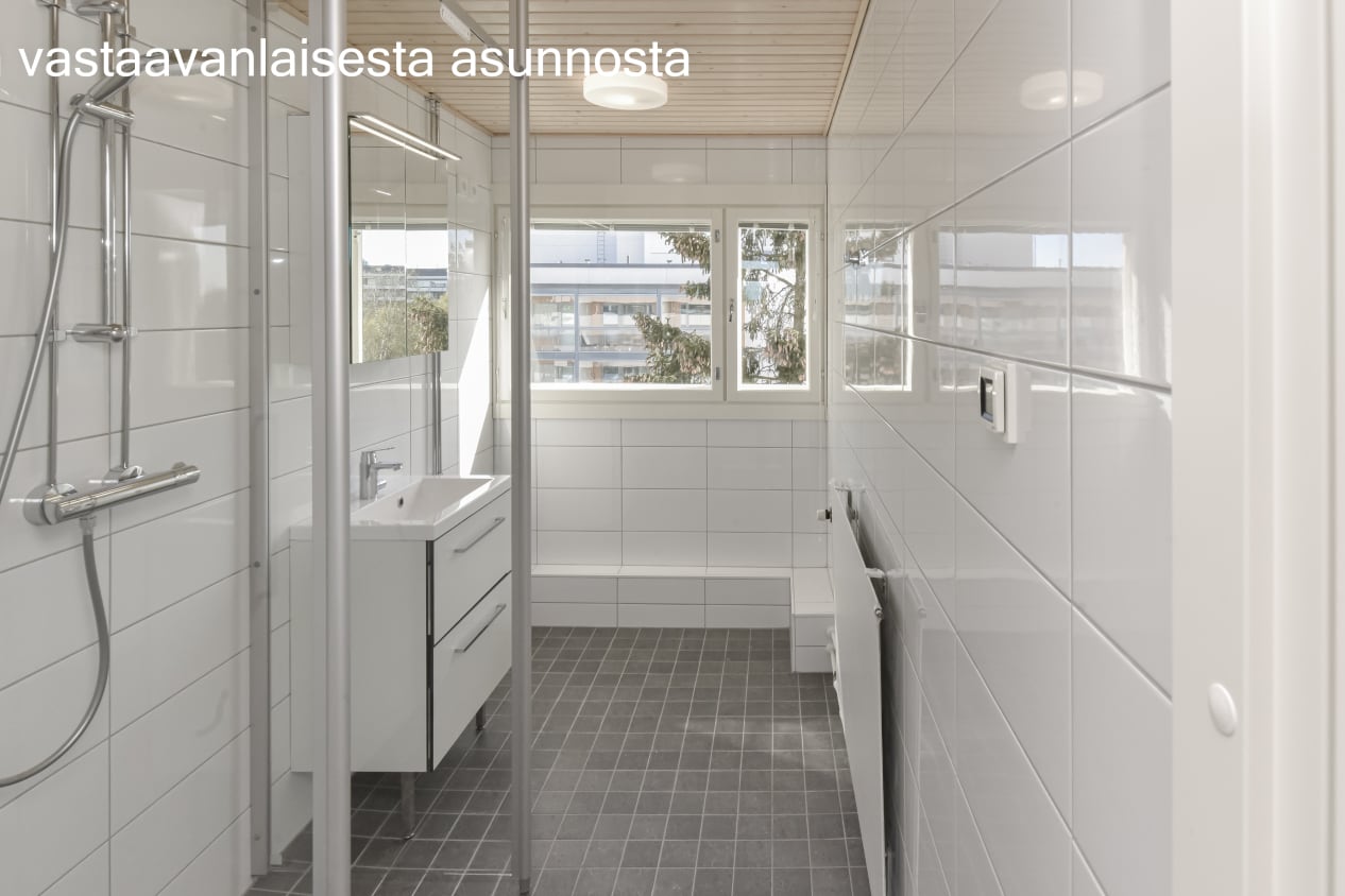 Remontoitu, avara koti on talon päädyssä ja sen ikkunat aukeavat talon molemmille puolille tuoden luonnonvalon osaksi sisustusta. Selkeän pohjaratkaisun ja suurien huoneiden ansiosta sisustat oman näköisesi kodin helposti. Kodin lattia on vaaleaa tammilaminaattia ja seinät on maalattu valkoisiksi. Kotikokkailulle löydät mukavasti tilaa erillisestä keittiöstä, jossa mahtuu myös ruokailemaan. Keittiön kaapistot ovat valkoiset. Ylä- ja alakaappien välinen tila ja työtaso ovat harmaata laminaattia. Varustukseen kuuluu keraaminen liesi, liesikupu, jääkaappipakastin ja astianpesukone. Kodinkoneet ovat valkoisia. Tilavan olohuoneen jatkona on länteen avautuva lasitettu parveke, jossa kelpaa nauttia kesäilloista. Ikkunallisessa kylpyhuoneessa ja erillisessä wc:ssä on valkoiset SATOn Kide-malliston kalusteet. Niiden seinät ovat valkoista laattaa ja lattia on harmaa. Pyykinpesukoneelle löytyy oma paikka kylpyhuoneesta.