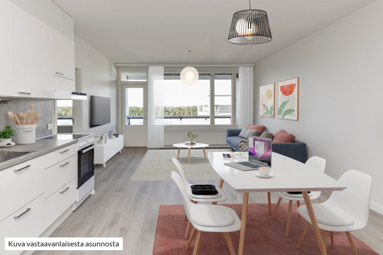 Remontoidun, valoisan asunnon ikkunat aukeavat molemmille puolin taloa. Selkeän pohjaratkaisun ansiosta sisustat oman näköisesi kodin helposti. Tilava olohuone ja avoin keittiö muodostavat avaran oleskelualueen, joka jatkuu ilta-aurinkoon suuntautuvalle lasitetulle parvekkeelle. Lisäksi viereisessä makuuhuoneessa on toinen parveke. Kodin lattiat ovat vaaleaa tammilaminaattia ja seinät on maalattu valkoisiksi. Keittiön kaapistot ovat valkoiset. Ylä- ja alakaappien välinen tila ja työtaso ovat harmaata laminaattia. Varustukseen kuuluu keraaminen liesi, liesikupu, jääkaappipakastin ja astianpesukone. Kodinkoneet ovat valkoisia. Ikkunallisessa kylpyhuoneessa ja erillisessä wc:ssä on valkoiset SATOn Kide-malliston kalusteet. Niiden seinät ovat valkoista laattaa ja lattia on harmaa. Pyykinpesukoneelle löytyy oma paikka kylpyhuoneesta. Runsaasti säilytystilaa löytyy makuuhuoneissa olevista vaatehuoneista.