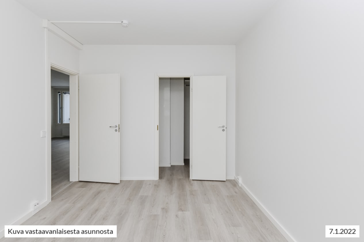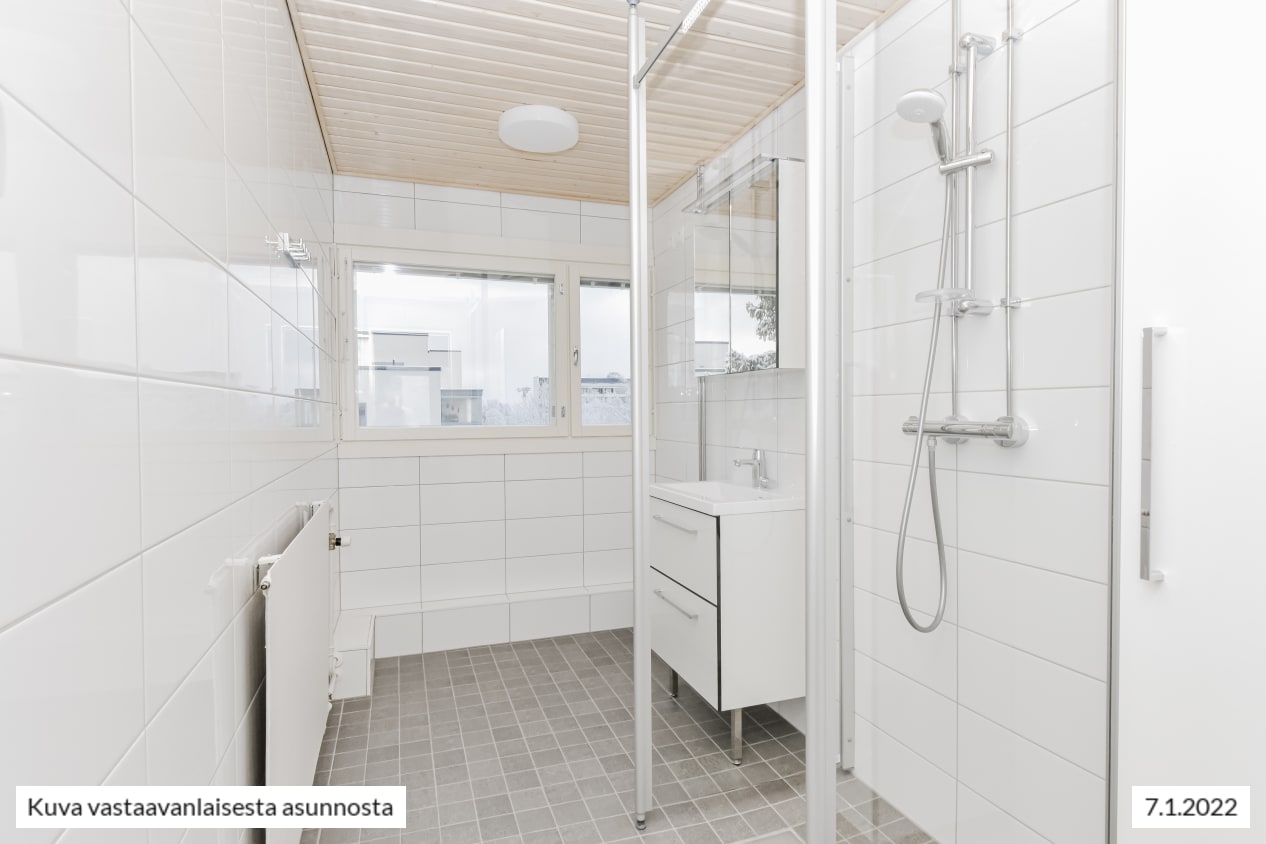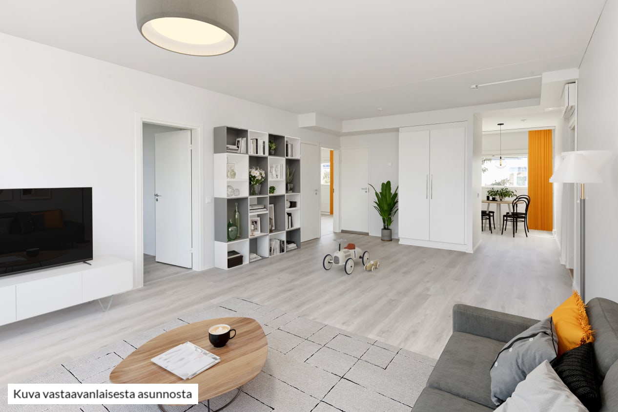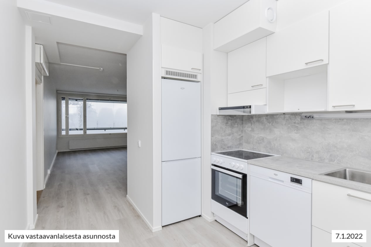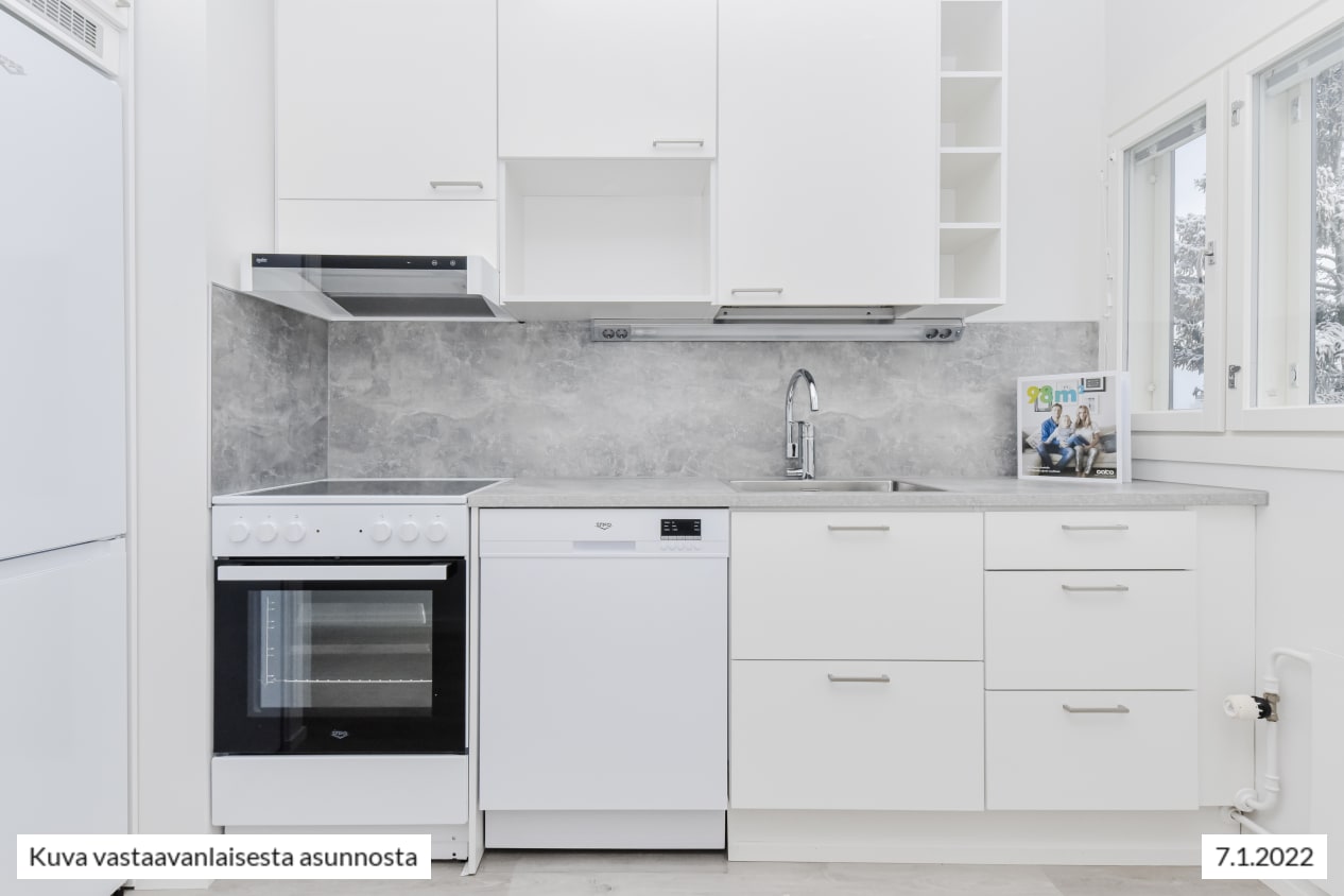 Remontoidun, valoisan asunnon ikkunat aukeavat molemmille puolin taloa. Selkeän pohjaratkaisun ansiosta sisustat oman näköisesi kodin helposti. Lattia on vaaleaa tammilaminaattia ja seinät on maalattu valkoisiksi. Erillisessä keittiössä kotikokki mahtuu puuhailemaan ja tilaan sopii myös ruokapöytä. Keittiön kaapistot ovat valkoiset. Ylä- ja alakaappien välinen tila ja työtaso ovat harmaata laminaattia. Varustukseen kuuluu keraaminen liesi, liesikupu, jääkaappipakastin ja astianpesukone. Kodinkoneet ovat valkoisia. Tilavan olohuoneen jatkona on ilta-aurinkoon avautuva lasitettu parveke ja toinen parveke on viereisessä makuuhuoneessa. Ikkunallisessa kylpyhuoneessa ja erillisessä wc:ssä on valkoiset SATOn Kide-malliston kalusteet. Niiden seinät ovat valkoista laattaa ja lattia on harmaa. Pyykinpesukoneelle löytyy oma paikka kylpyhuoneesta. Runsaasti säilytystilaa löytyy makuuhuoneissa olevista vaatehuoneista.