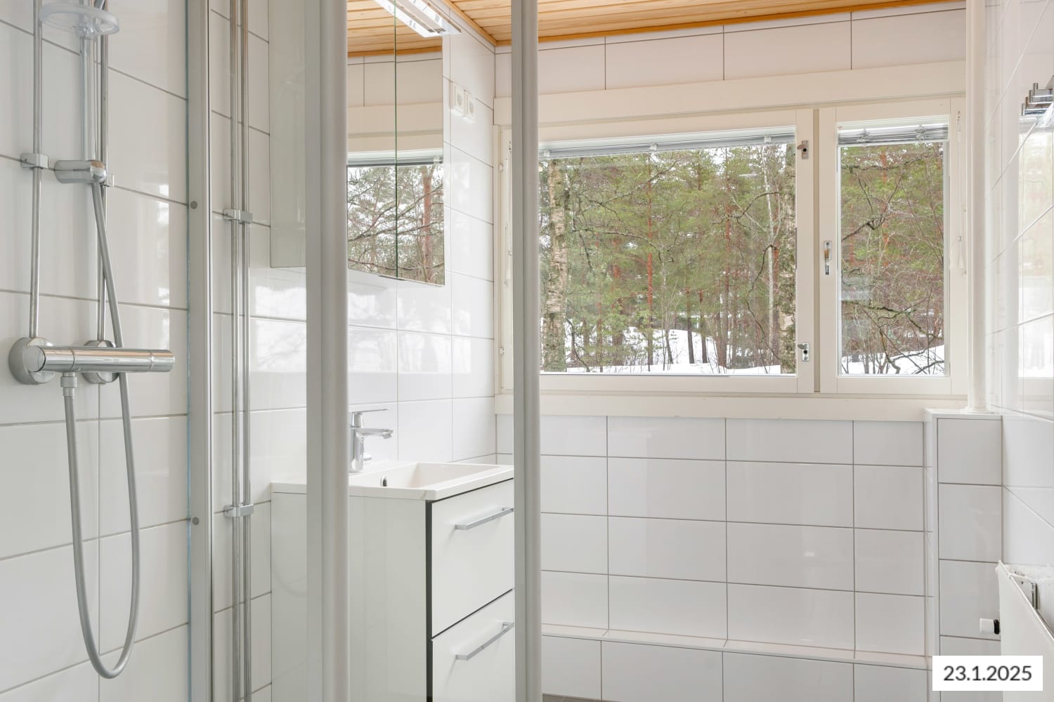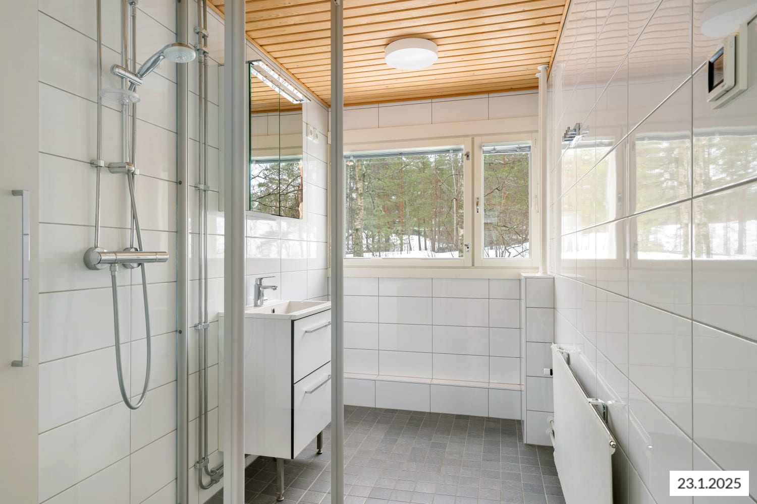 Keittiön kaapistot ovat valkoiset. Ylä- ja alakaappien välinen tila ja työtaso ovat harmaata laminaattia. Varustukseen kuuluu keraaminen liesi, liesikupu, jääkaappipakastin ja astianpesukone. Kodinkoneet ovat valkoisia. Ikkunallisessa kylpyhuoneessa ja erillisessä wc:ssä on valkoiset SATOn Kide-malliston kalusteet. Niiden seinät ovat valkoista laattaa ja lattia on harmaa. Pyykinpesukoneelle löytyy oma paikka kylpyhuoneesta. Runsaasti säilytystilaa löytyy makuuhuoneissa olevista vaatehuoneista.
