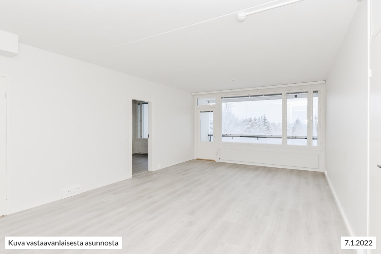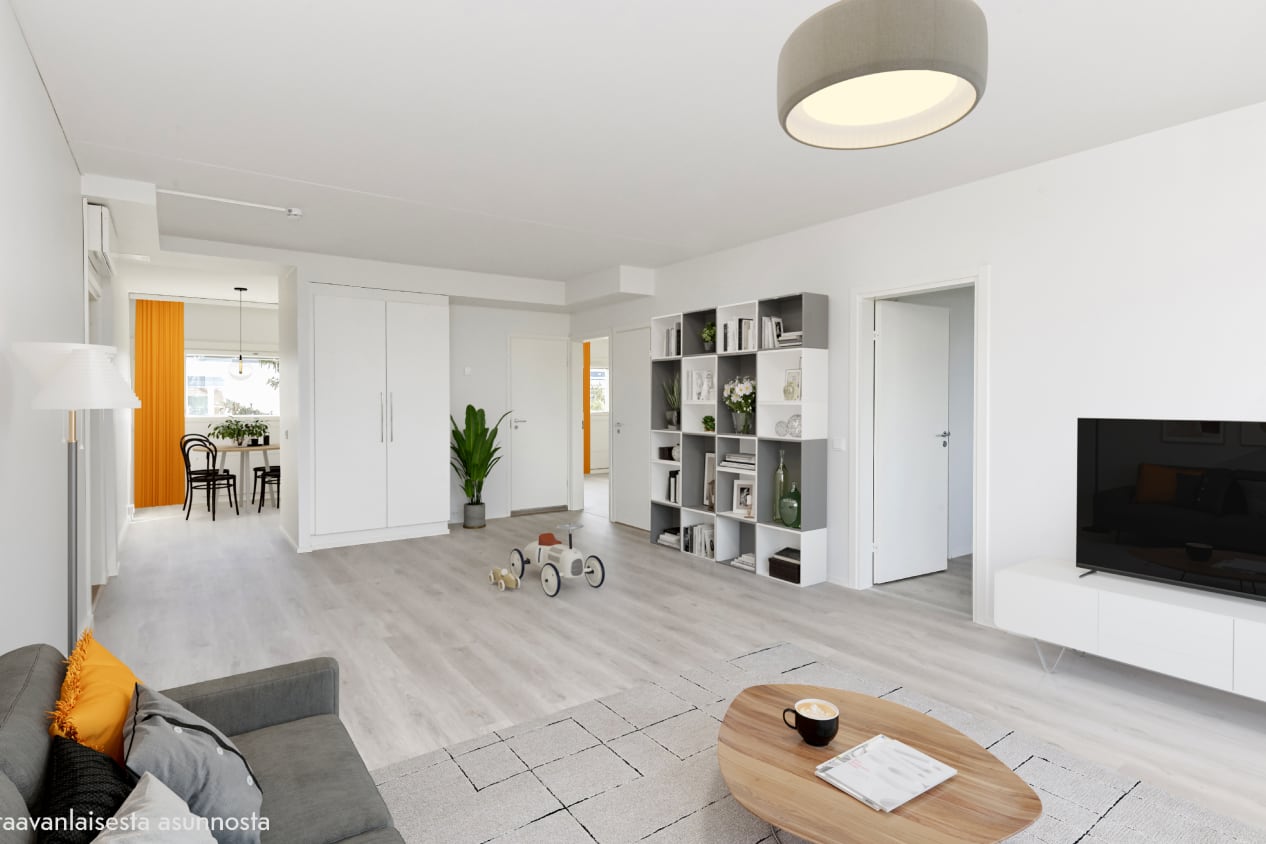 Remontoidun, valoisan asunnon ikkunat aukeavat molemmille puolin taloa. Selkeän pohjaratkaisun ansiosta sisustat oman näköisesi kodin helposti. Lattia on vaaleaa tammilaminaattia ja seinät on maalattu valkoisiksi. Erillisessä keittiössä kotikokki mahtuu puuhailemaan ja tilaan sopii myös ruokapöytä. Keittiön kaapistot ovat valkoiset. Ylä- ja alakaappien välinen tila ja työtaso ovat harmaata laminaattia. Varustukseen kuuluu keraaminen liesi, liesikupu, jääkaappipakastin ja astianpesukone. Kodinkoneet ovat valkoisia. Tilavan olohuoneen jatkona on ilta-aurinkoon avautuva lasitettu parveke ja toinen parveke on viereisessä makuuhuoneessa. Ikkunallisessa kylpyhuoneessa ja erillisessä wc:ssä on valkoiset SATOn Kide-malliston kalusteet. Niiden seinät ovat valkoista laattaa ja lattia on harmaa. Pyykinpesukoneelle löytyy oma paikka kylpyhuoneesta. Runsaasti säilytystilaa löytyy peräti kolmesta vaatehuoneesta.