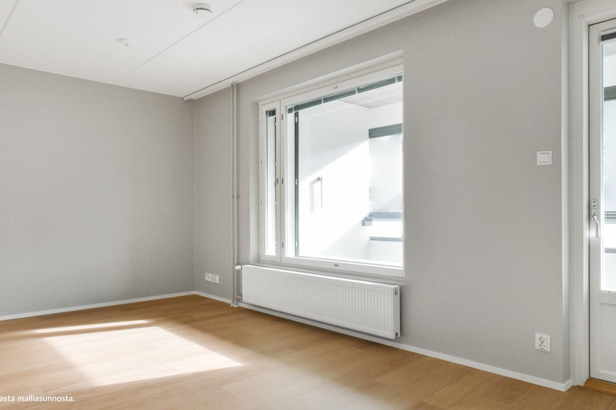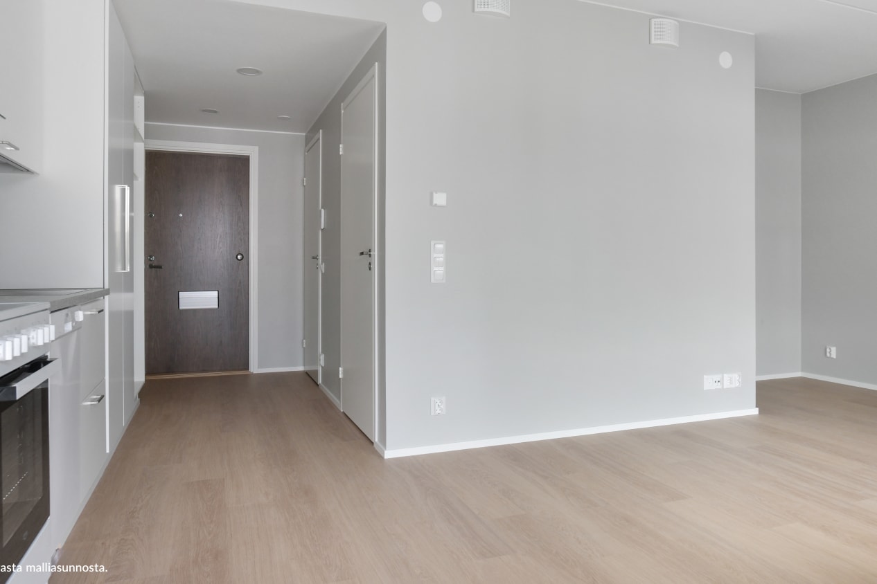 Upouuden, neliöitään tilavamman tuntuisen yksiön kalustat helposti omaksi kodiksi. Keittiötilan yhteyteen sopii ruokapöytä ja auringossa paistattelevalle lasitetulle parvekkeelle rakennat helposti oman kesäparatiisin. Eteisessä on reilusti säilytystilaa erillisessä varastossa. Ikkunassa on sälekaihtimet valmiina. Lattia on vaaleaa tammilaminaattia ja seinät on maalattu vaalean harmaalla. Keittiökaapistot ovat raikkaan valkoiset ja ylä- ja alakaappien välinen tila sekä työtaso ovat harmaata laminaattia. Varustukseen kuuluu astianpesukone, keraaminen liesi ja jääkaappipakastin. Kylpyhuoneessa on valkoiset SATOn Kide-malliston kalusteet. Seinät ovat valkoista laattaa ja lattia on harmaa. Pesukoneelle ja kuivausrummulle on paikka.