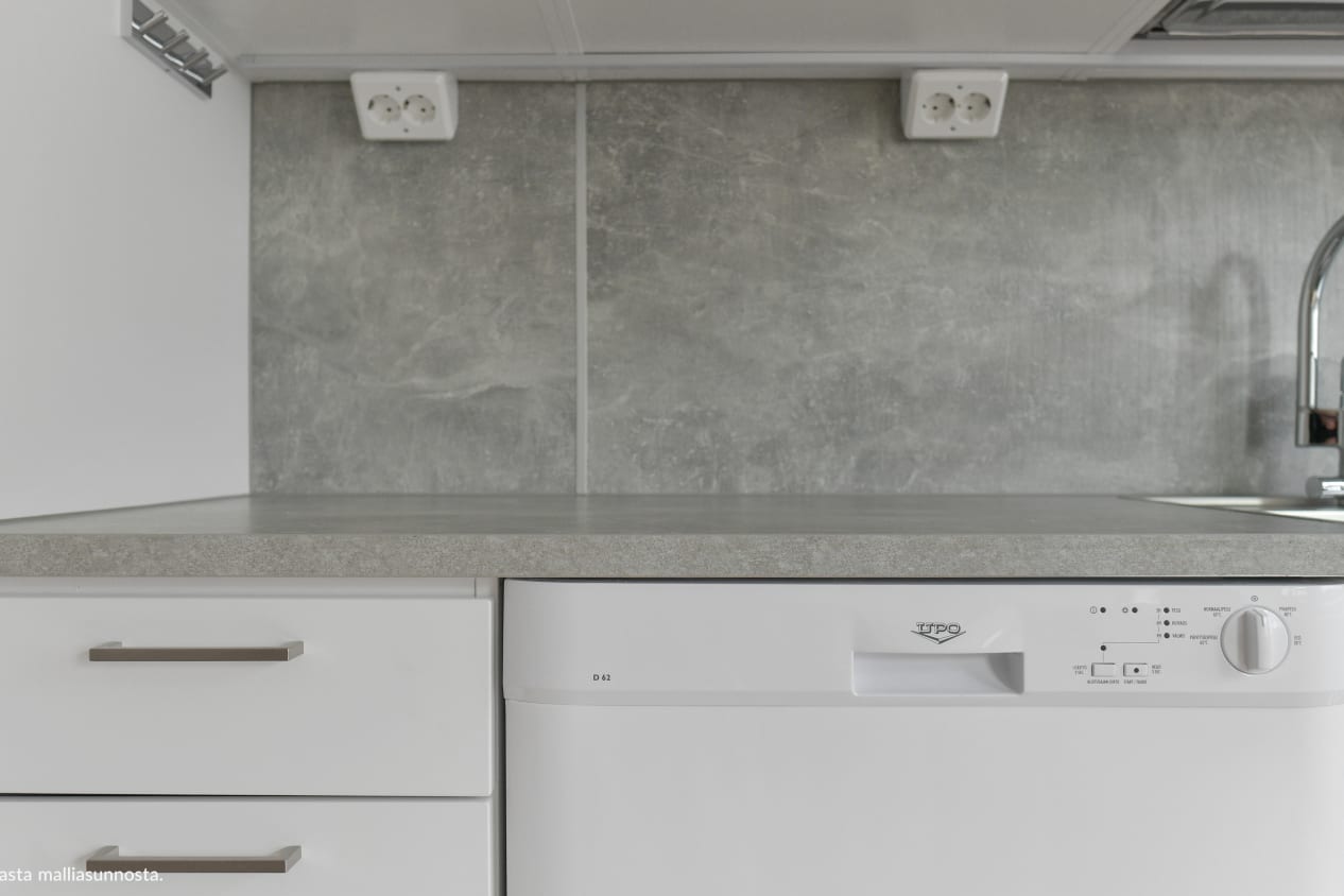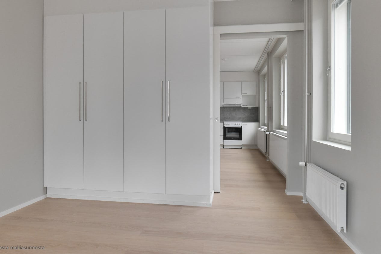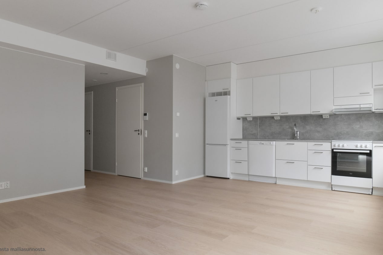 Ihan uuden kulmahuoneiston sydän on avoimen keittiötilan ja olohuoneen muodostama avara oleskelutila, johon tulvii aamuauringon valo. Lasitetulle parvekkeelle astutaan makuuhuoneesta. Eteisessä on reilusti säilytystilaa erillisessä varastossa. Ikkunoissa on sälekaihtimet valmiina. Lattia on vaaleaa tammilaminaattia ja seinät on maalattu vaalean harmaalla. Keittiökaapistot ovat raikkaan valkoiset ja ylä- ja alakaappien välinen tila sekä työtaso ovat harmaata laminaattia. Varustukseen kuuluu astianpesukone, keraaminen liesi ja jääkaappipakastin. Kylpyhuoneessa on valkoiset SATOn Kide-malliston kalusteet. Seinät ovat valkoista laattaa ja lattia on harmaa. Pesukoneelle ja kuivausrummulle on paikka.