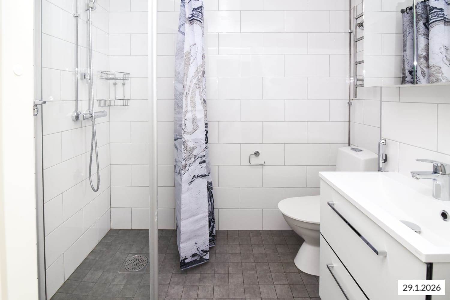 Kylpyhuoneessa on valkoiset Kide-malliston kotimaiset kalusteet. Seinät ovat valkoista laattaa ja lattia on harmaa. Pesukoneelle on varaus.
