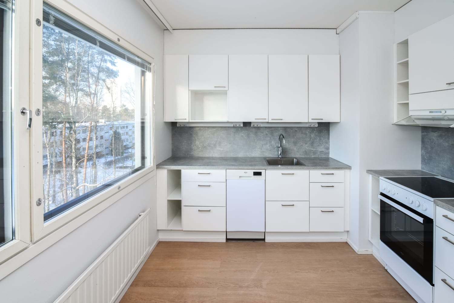 Erillisessä keittiössä on tilaa sekä kokkailla että ruokailla. Linjakkaat kaapistot ovat valkoiset ja niiden pinta mukailee puun kuvioita. Ylä- ja alakaappien välinen tila ja työtaso ovat harmaata laminaattia. Varustukseen kuuluu keraaminen liesi, liesikupu, astianpesukone ja jääkaappipakastin. Kodinkoneet ovat valkoisia.