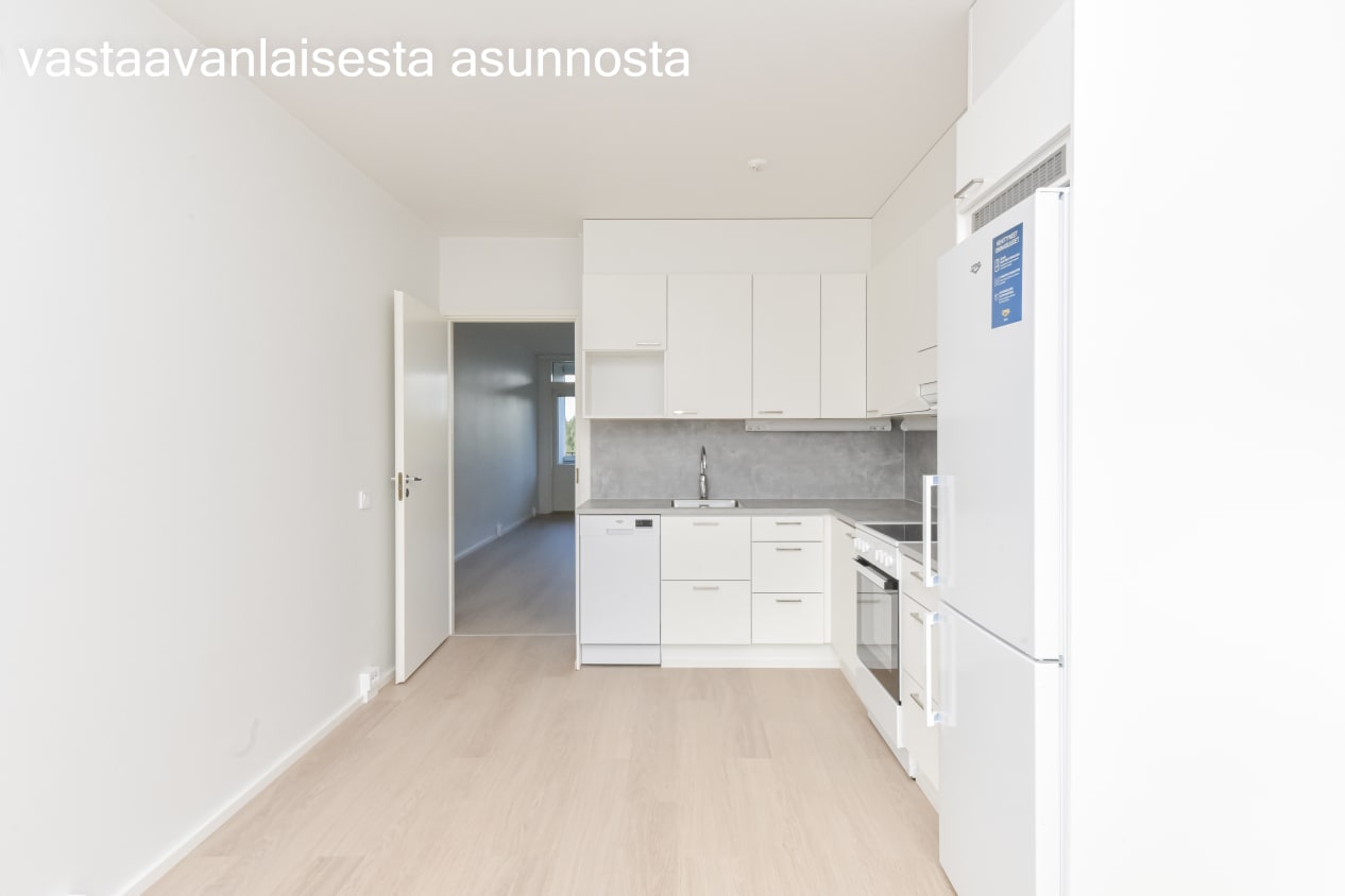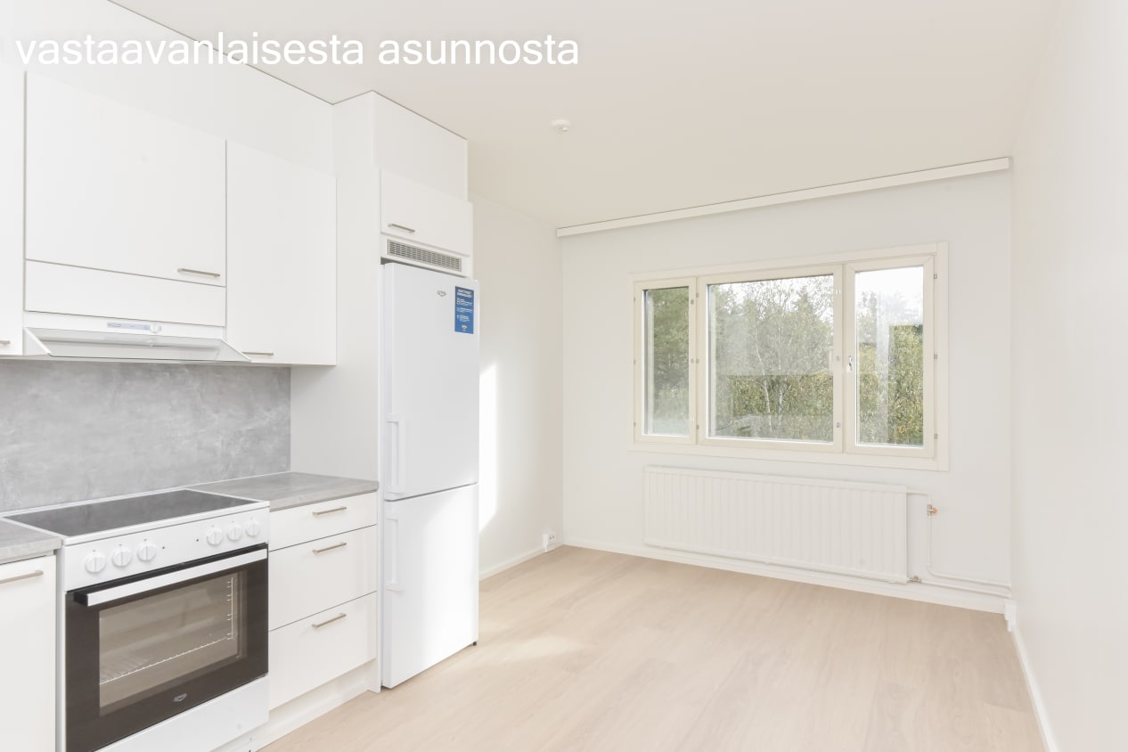 Kotikokkailulle löydät mukavasti tilaa erillisestä keittiöstä, jossa mahtuu myös ruokailemaan. Keittiön kaapistot ovat valkoiset. Ylä- ja alakaappien välinen tila ja työtaso ovat harmaata laminaattia. Varustukseen kuuluu keraaminen liesi, liesikupu ja jääkaappipakastin. Kodinkoneet ovat valkoisia.