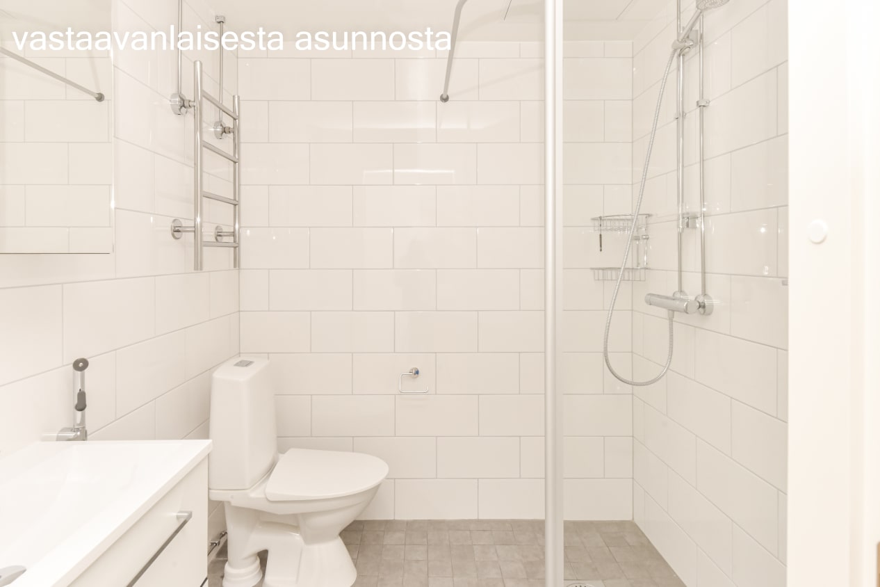Kylpyhuoneessa on valkoiset Kide-malliston kotimaiset kalusteet. Seinät ovat valkoista laattaa ja lattia on harmaa. Pyykinpesukoneelle on varaus.