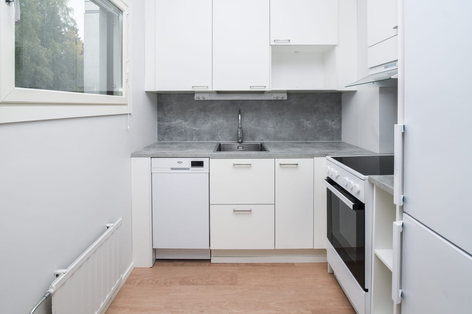 Keittiötilaan valoa tulee hauskasta pikkuikkunasta. Linjakkaat kaapistot ovat valkoiset ja niiden pinta mukailee puun kuvioita. Ylä- ja alakaappien välinen tila ja työtaso ovat harmaata laminaattia. Varustukseen kuuluu keraaminen liesi, liesikupu, astianpesukone ja jääkaappipakastin. Kodinkoneet ovat valkoisia.