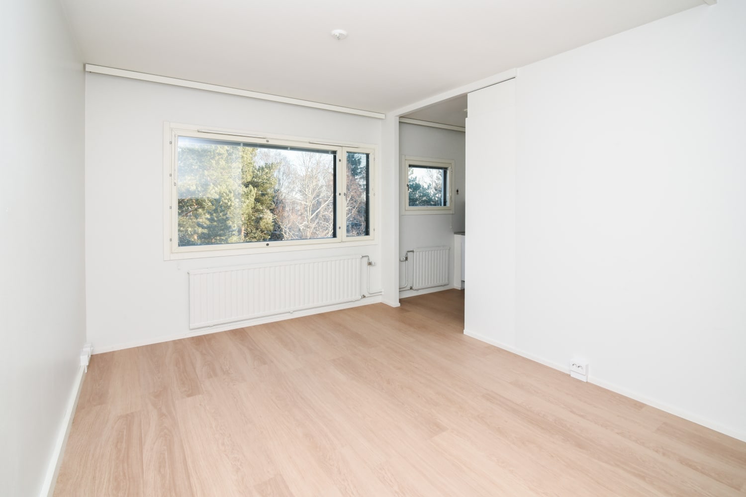 Remontoitu, sympaattinen yksiö saa neliöitään avaramman tunnelmansa isosta ikkunasta, joka avautuu vehreän takapihan puolelle. Kodin pintamateriaalit ovat vaaleita ja pelkistetyn yksinkertaisia. Lattia on vaaleaa tammilaminaattia ja seinät on maalattu valkoisiksi. Keittiötilaan valoa tulee hauskasta pikkuikkunasta. Linjakkaat kaapistot ovat valkoiset ja niiden pinta mukailee puun kuvioita. Ylä- ja alakaappien välinen tila ja työtaso ovat harmaata laminaattia. Varustukseen kuuluu keraaminen liesi, liesikupu, astianpesukone ja jääkaappipakastin. Kodinkoneet ovat valkoisia. Kylpyhuoneessa on valkoiset SATOn Kide-malliston kalusteet. Seinät ovat valkoista laattaa ja lattia on harmaa. Pesukoneelle on varaus.